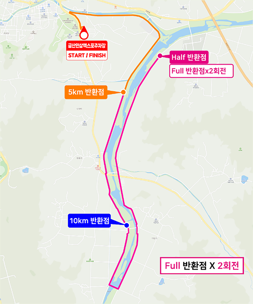 코스는 하천과 강 주변을 따라 달리는 형태로 구성되어 있어요. 풀코스는 같은 구간을 두 번 도는 2회전 뺑뺑이 코스입니다.