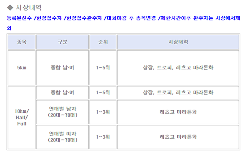 따라서 페이스 배분이 매우 중요해요. 전반부에 너무 천천히 달리면 반환점 컷오프에 걸릴 수 있고, 너무 빠르게 시작하면 후반부에 체력이 떨어질 수 있으니 자신의 페이스를 잘 유지하는 게 완주의 핵심입니다.시상 내역 총정리
