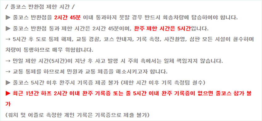 처음 풀코스에 도전하시는 분들도 예외 없이 기록증이 필요하다는 점 꼭 기억하세요. 러닝 앱의 기록만으로는 인정되지 않으니, 공인 대회에서 받은 정식 기록증을 준비하셔야 합니다.제한 시간 규정