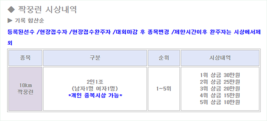 특별히 주목할 만한 건 짝궁런 이벤트예요. 커플이나 친구와 함께 참가해서 1위부터 5위까지 들면 상금을 받을 수 있는데, 1위는 무려 30만 원입니다. 개인 경기 시상과도 중복이 가능하니 함께 달릴 파트너가 있다면 적극 참여해보세요.코스 특징 분석