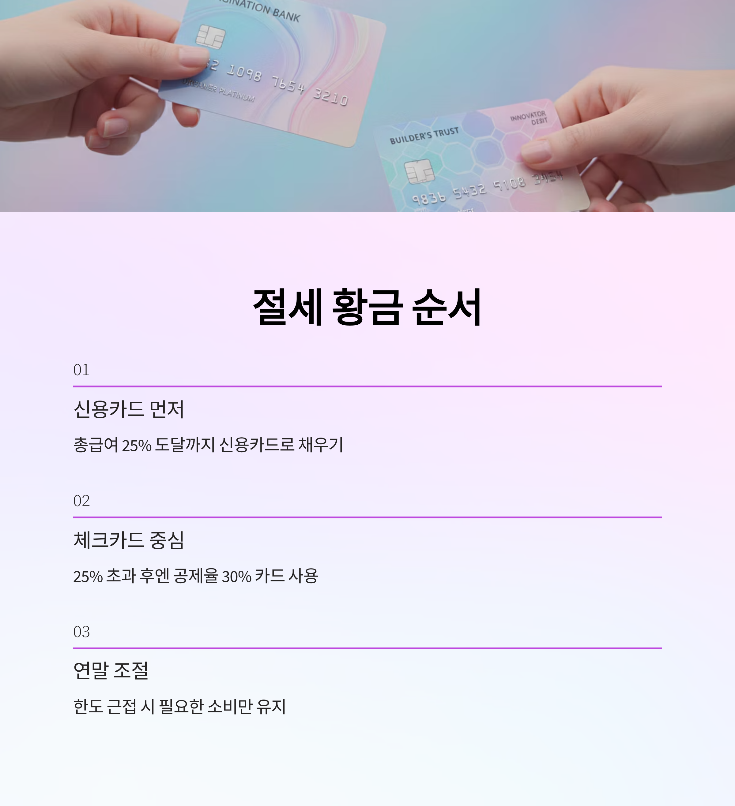 25% 이전 구간은 공제가 아예 되지 않으므로, 공제율이 높은 체크카드를 먼저 쓰면 이 구간을 ‘허비’하는 셈입니다.