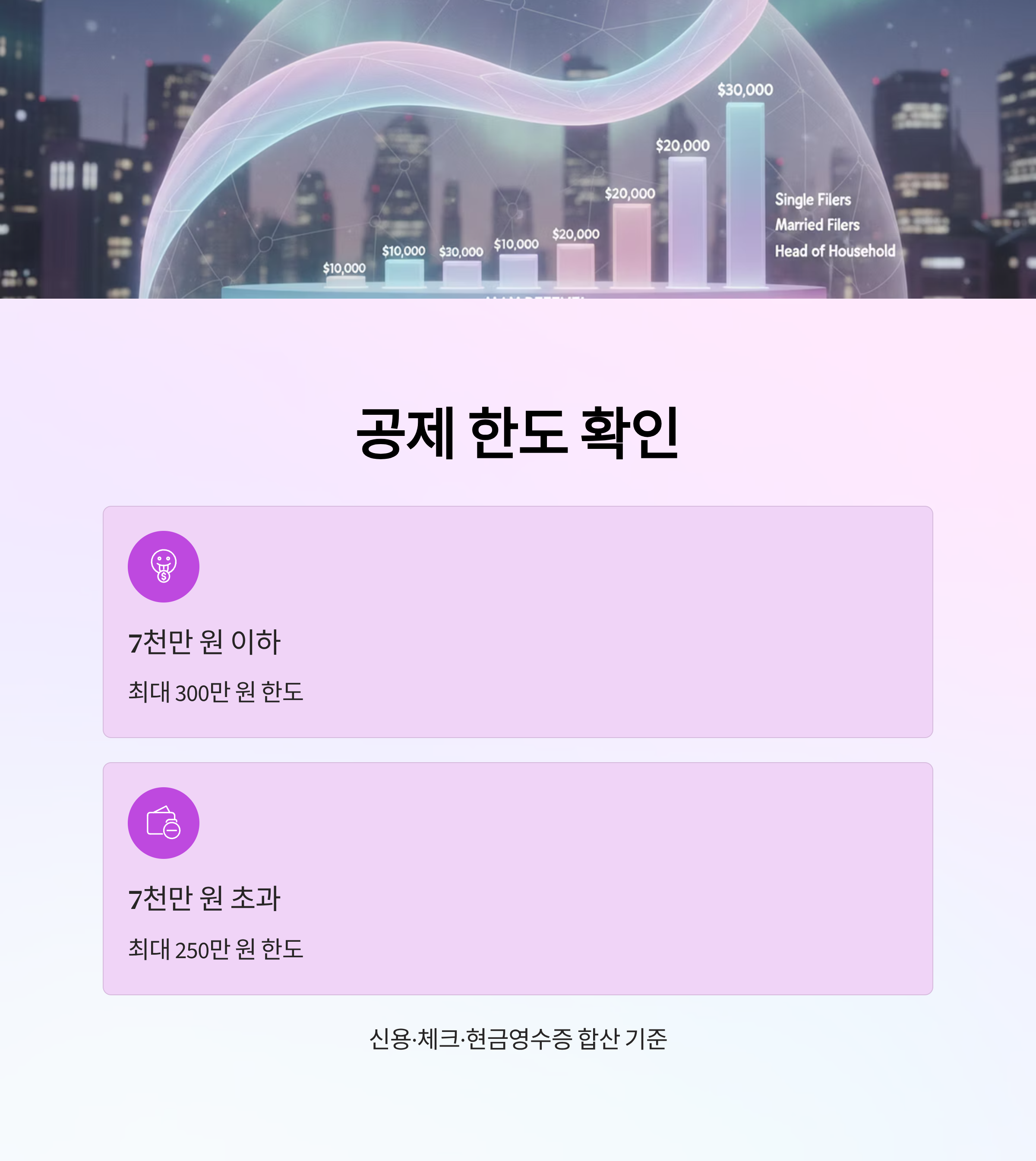 이 조건을 충족하면 가족 명의 카드나 현금영수증 사용액도 근로자 공제 대상이 되어 실질적인 공제 규모를 키울 수 있습니다.4. 공제 한도와 적용 기준