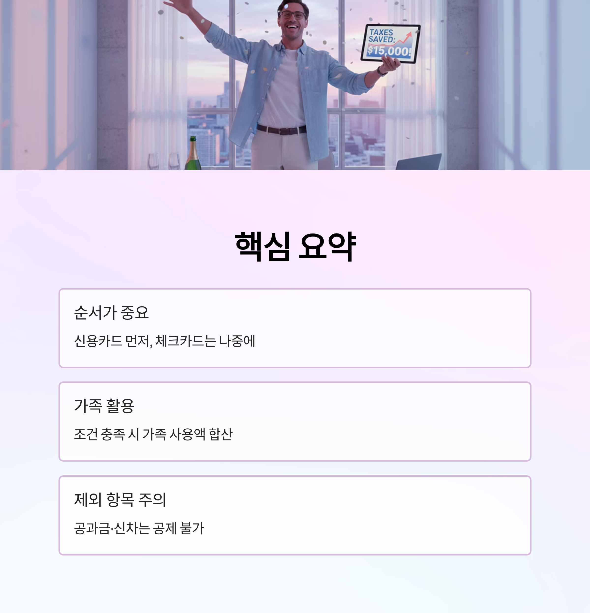 같은 금액을 쓰더라도 카드 종류에 따라 공제율이 달라지고, 가족 사용액까지 포함할 수 있는 경우도 있어 전략적으로 접근하면 절세 효과가 커집니다.