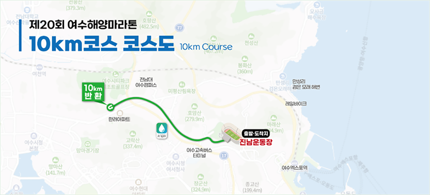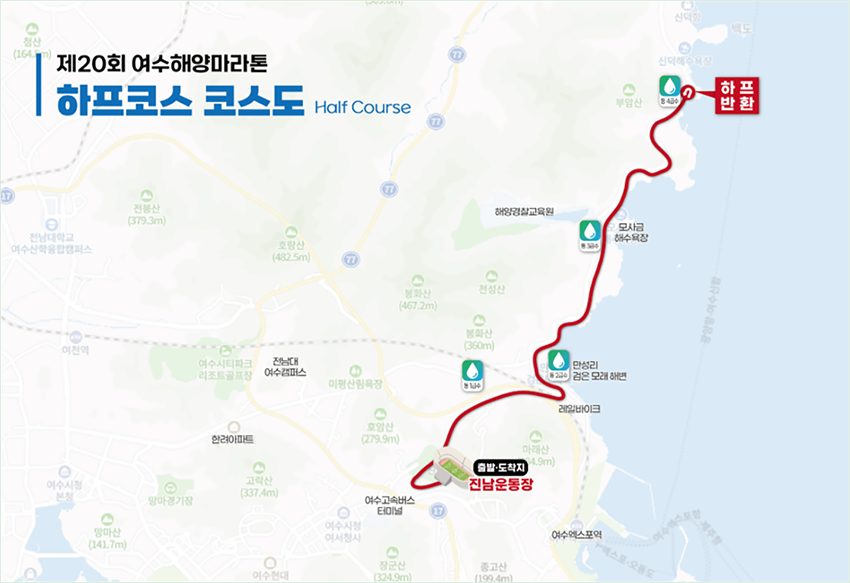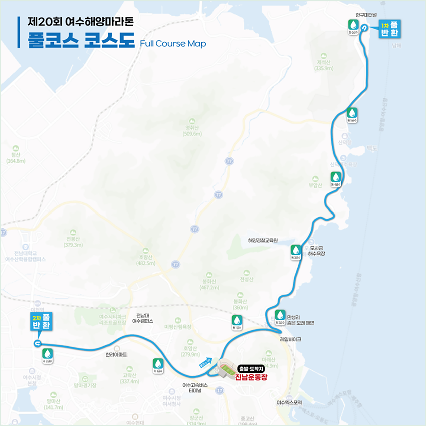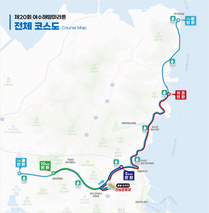 풀코스의 경우 진남운동장에서 출발해서 제석산 인근 한구미터널까지 달린 후 첫 번째 반환점을 돌아요. 그 다음 다시 출발지 방향으로 돌아왔다가 전남대 여수캠퍼스 쪽으로 이동해 두 번째 반환점을 거쳐 최종적으로 진남운동장으로 골인하는 구조예요.일반적인 환상형(고리) 코스가 아니라 두 번의 반환점을 거치는 독특한 형태라서 처음에는 조금 낯설 수 있지만, 덕분에 바다와 시내를 번갈아 볼 수 있어 지루하지 않다는 평가가 많아요.