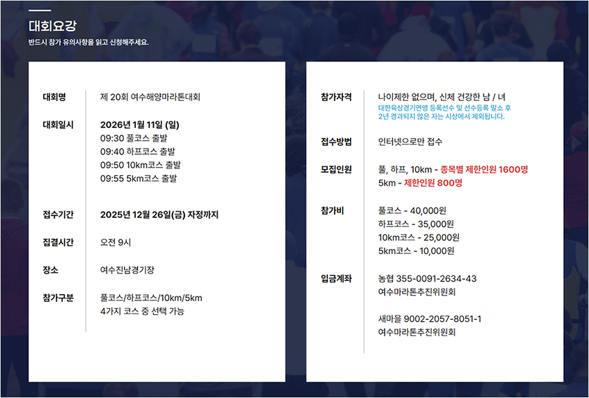 20년 가까이 이어온 안정적인 운영 노하우와 초보자부터 베테랑 러너까지 만족할 수 있는 다양한 코스 구성까지, 2026 여수 해양 마라톤의 모든 정보를 지금부터 하나씩 살펴볼게요.참가를 고민 중이시라면 이 글을 끝까지 읽어보시면 결정에 큰 도움이 되실 거예요!