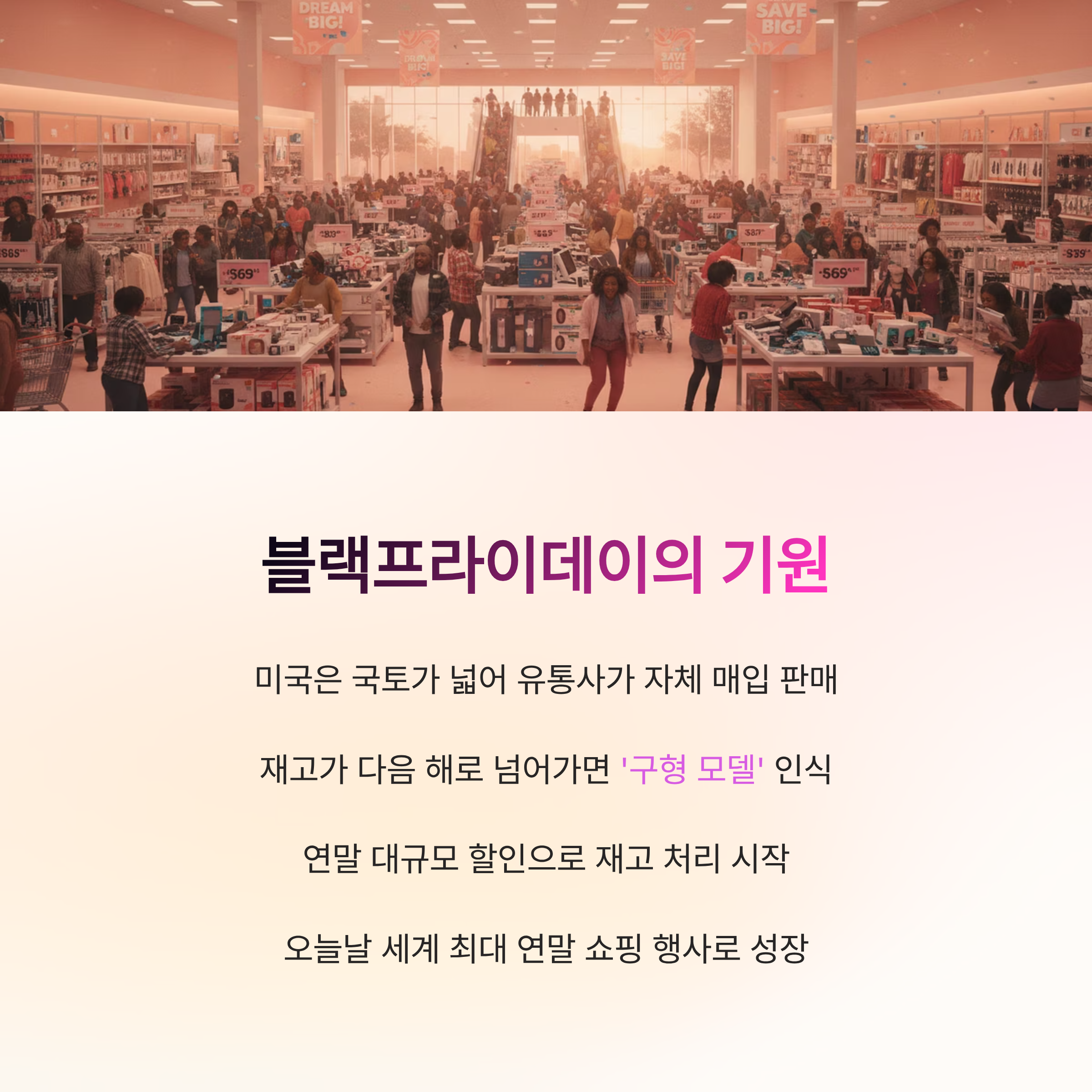 블랙프라이데이는 이를 확인할 수 있는 가장 명확한 시기입니다.미국은 국토가 넓어 유통사가 자체적으로 제품을 매입해 판매하는 구조인데, 이 때문에 재고가 다음 해로 넘어가면 곧바로 ‘구형 모델’로 인식되며 가격 경쟁력이 떨어집니다. 이를 해결하기 위해 연말에 대규모 할인 이벤트를 시작한 것이 블랙프라이데이의 기원입니다.