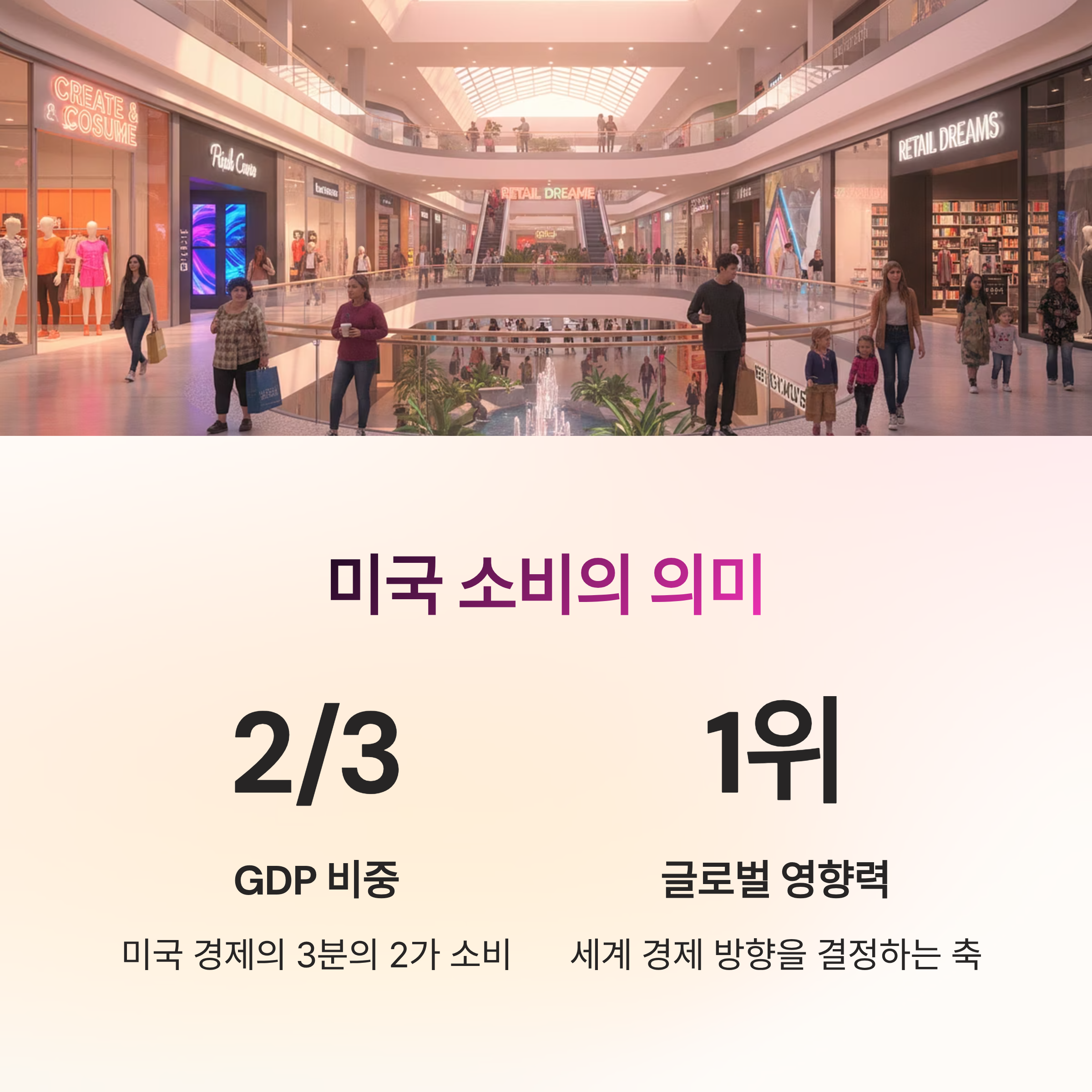 미국 소비는 단순한 쇼핑 수준을 넘어 세계 경제의 방향을 결정하는 축입니다.미국 GDP의 약 3분의 2가 소비에서 나오고, 그 소비 상당수가 수입품으로 채워지기 때문에 글로벌 공급망과 제조업 국가들에도 큰 영향을 미칩니다.