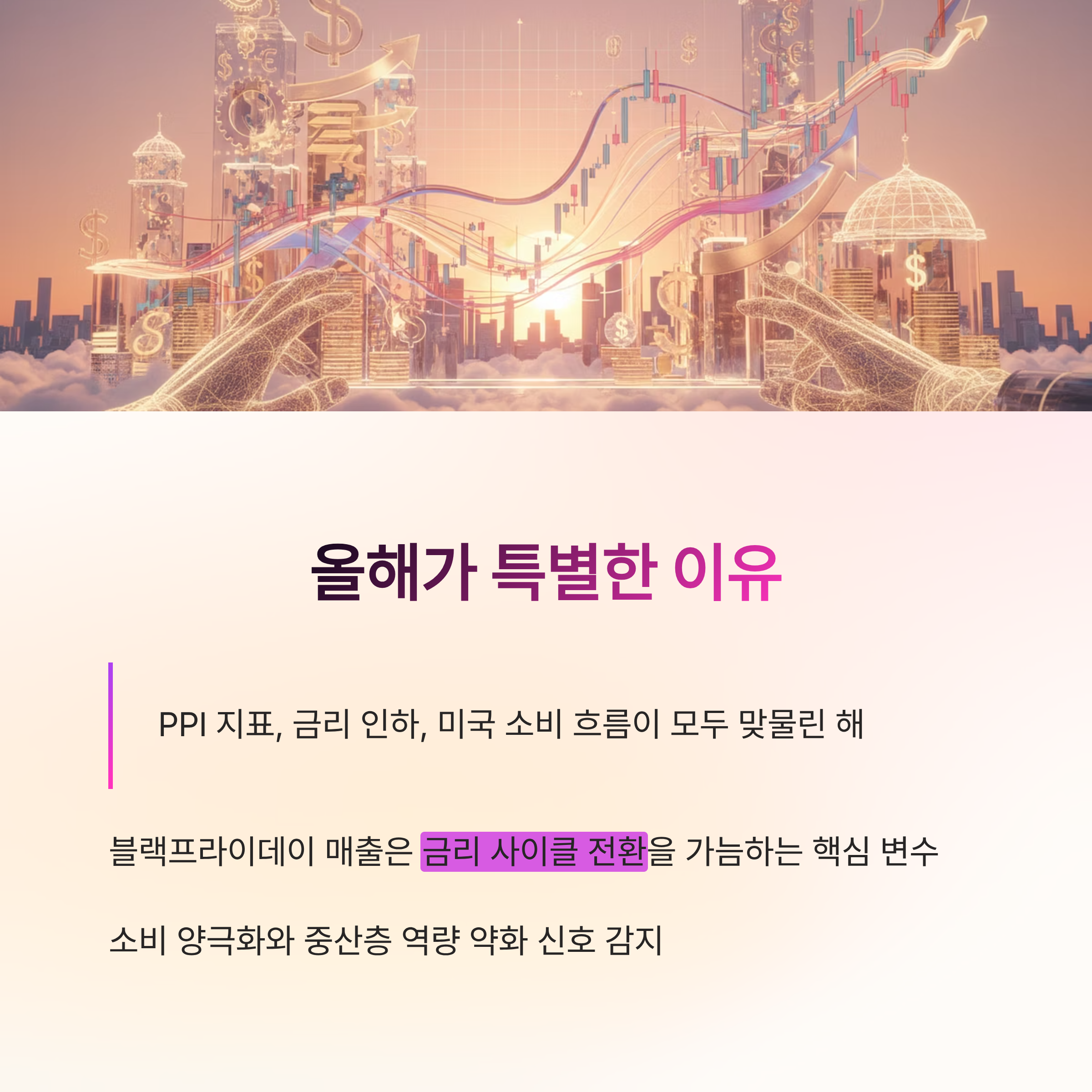 올해는 PPI 지표, 금리 인하 여부, 미국 소비 흐름이 모두 맞물려 있어 어느 해보다 블랙프라이데이 매출의 중요성이 부각되고 있습니다. 따라서 올해 블랙프라이데이 매출은 단순한 쇼핑 지표가 아닌, 금리 사이클 전환을 가늠하는 핵심 변수라고 할 수 있습니다.