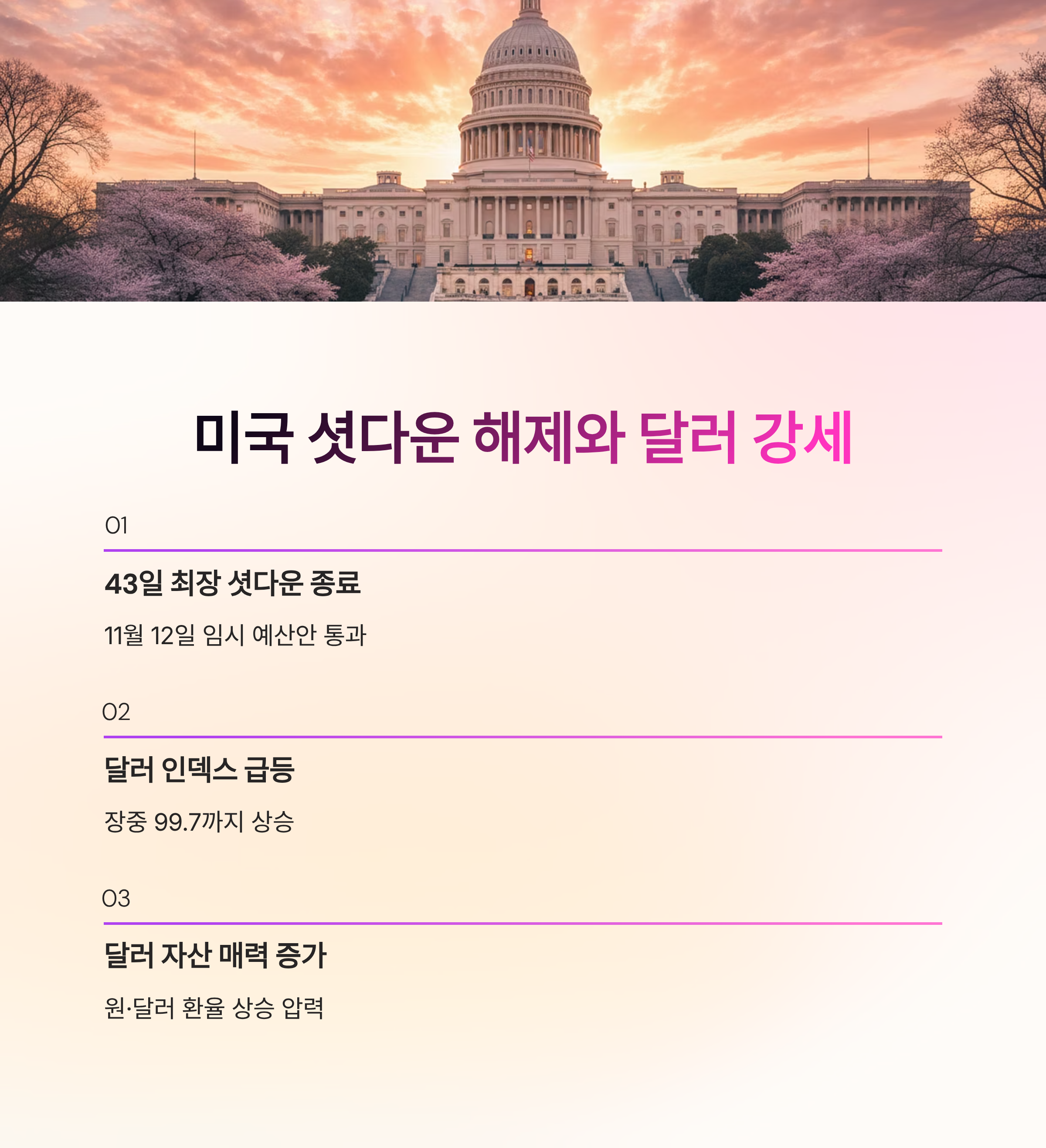 미국 연방정부는 43일간 이어진 최장 셧다운을 11월 12일 끝냈습니다.하원이 임시 예산안을 가결하고 대통령 서명을 통해 정부 기능이 정상화되면서 달러 강세가 나타났습니다. 달러 인덱스는 11일 장중 99.7까지 상승했는데요, 미국 경제가 정상화되면 달러 자산의 매력이 커지고, 이에 따라 원·달러 환율도 상승하게 됩니다.