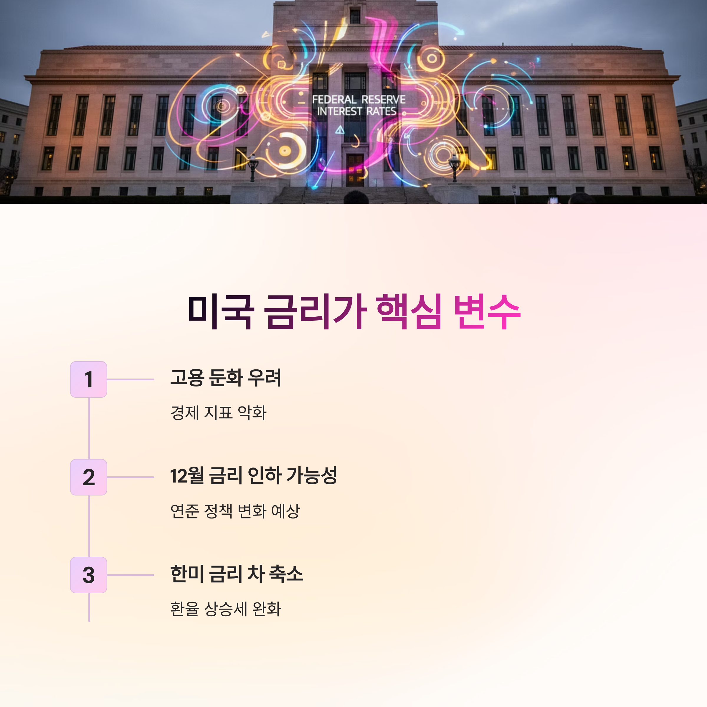 환율 향방에서 가장 큰 변수 중 하나는 미국 금리입니다.최근 미국 고용 둔화 우려로 12월 연준이 금리를 내릴 가능성이 제기되고 있습니다. 금리가 내려가면 한·미 금리 차가 줄어들어 원·달러 환율 상승세가 완화될 수 있습니다. 반대로 미국 금리가 한국보다 계속 높으면, 달러 자산 매력이 커지면서 환율이 더 오를 가능성이 있습니다.