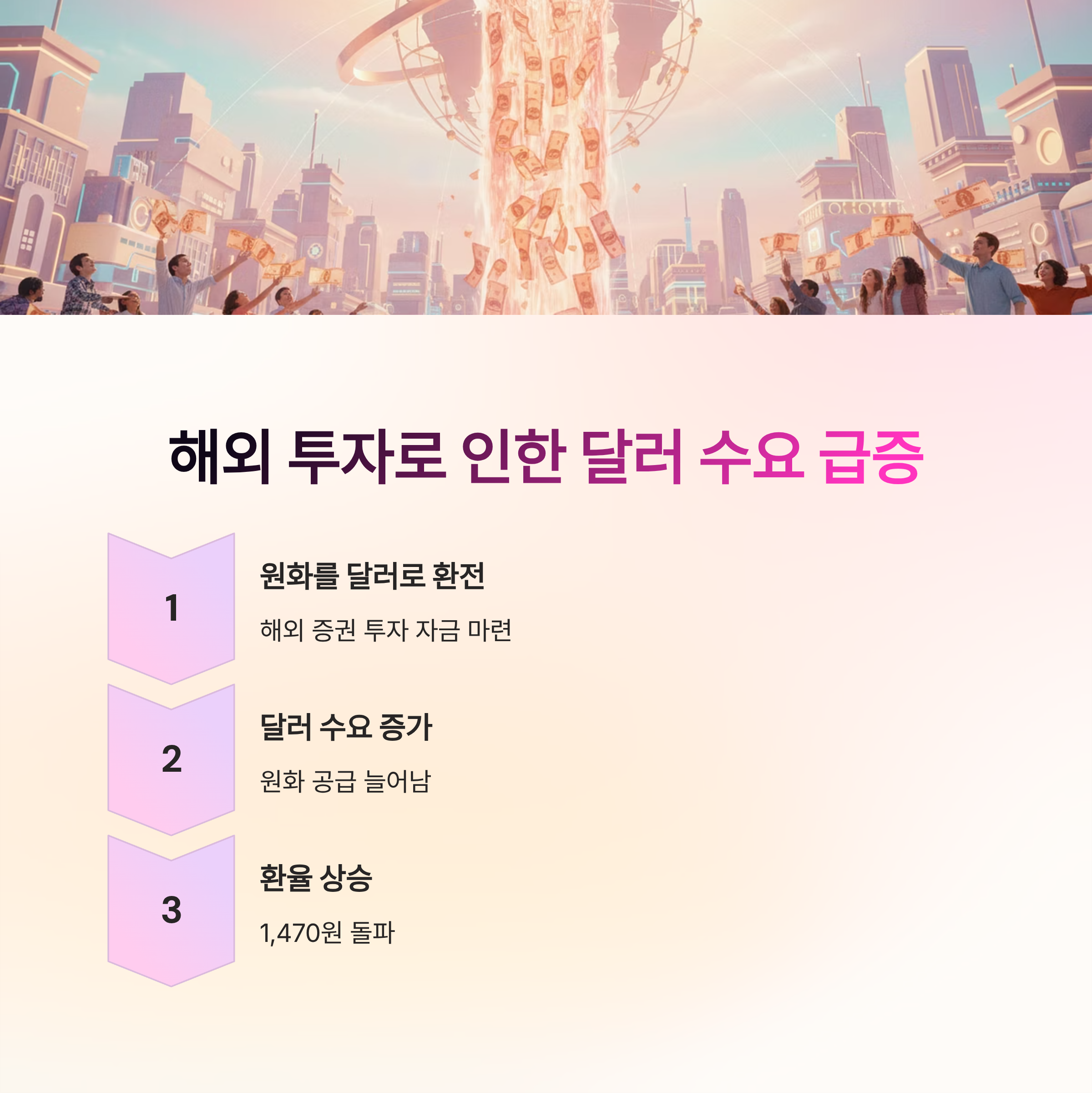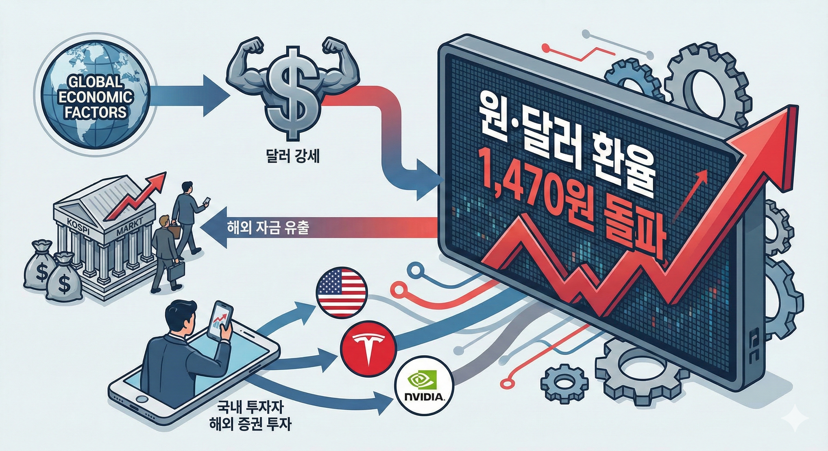 원·달러 환율이 최근 1,470원을 돌파하면서 투자자들의 관심이 집중되고 있습니다.단순히 단기적 움직임이 아니라, 글로벌 경제 요인과 국내 투자 흐름이 복합적으로 작용한 결과입니다. 환율 상승은 해외 투자자금 유출, 달러 강세, 국내 투자자의 해외 증권 투자 등 여러 요인이 동시에 맞물릴 때 더욱 빠르게 나타납니다.