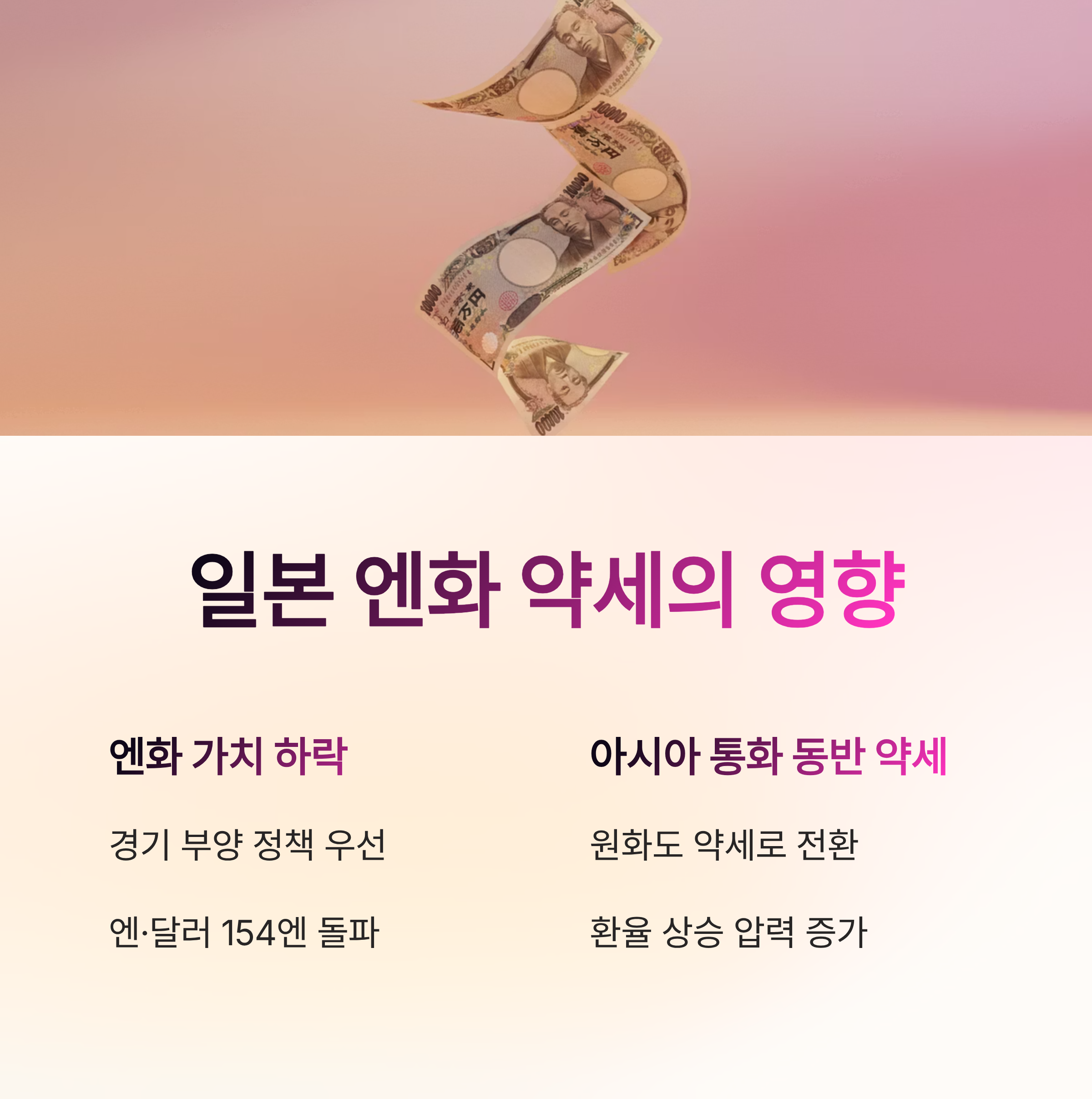 엔화 가치 하락도 원·달러 환율 상승에 영향을 주었습니다.일본 총리가 재정 건전성보다 경기 부양을 우선하겠다고 밝히면서, 돈을 많이 풀 경우 엔화가 약세를 보였죠. 엔·달러 환율은 154엔을 넘어섰고, 이는 다른 아시아 통화에도 영향을 주어 원화 약세로 이어졌습니다.