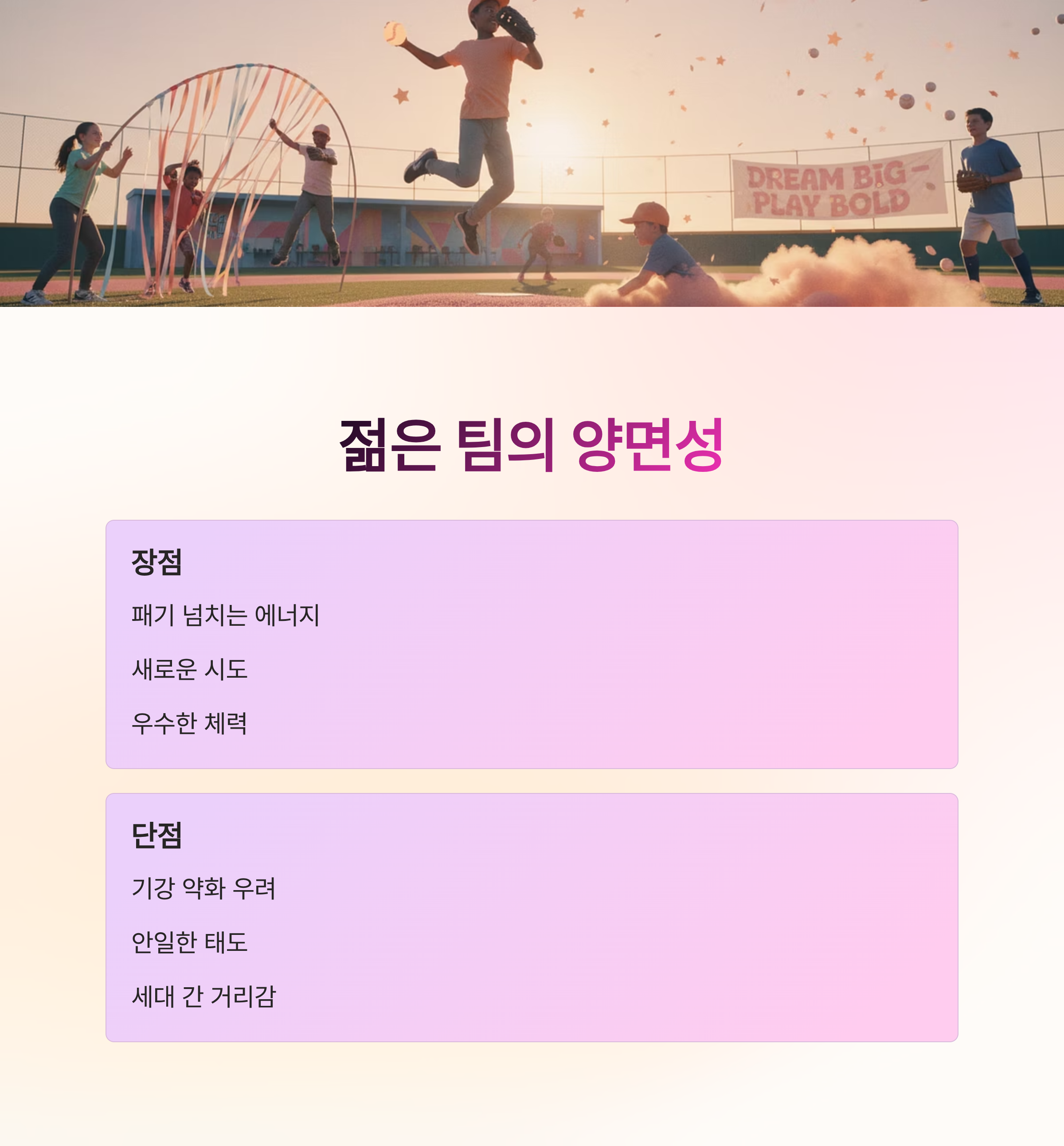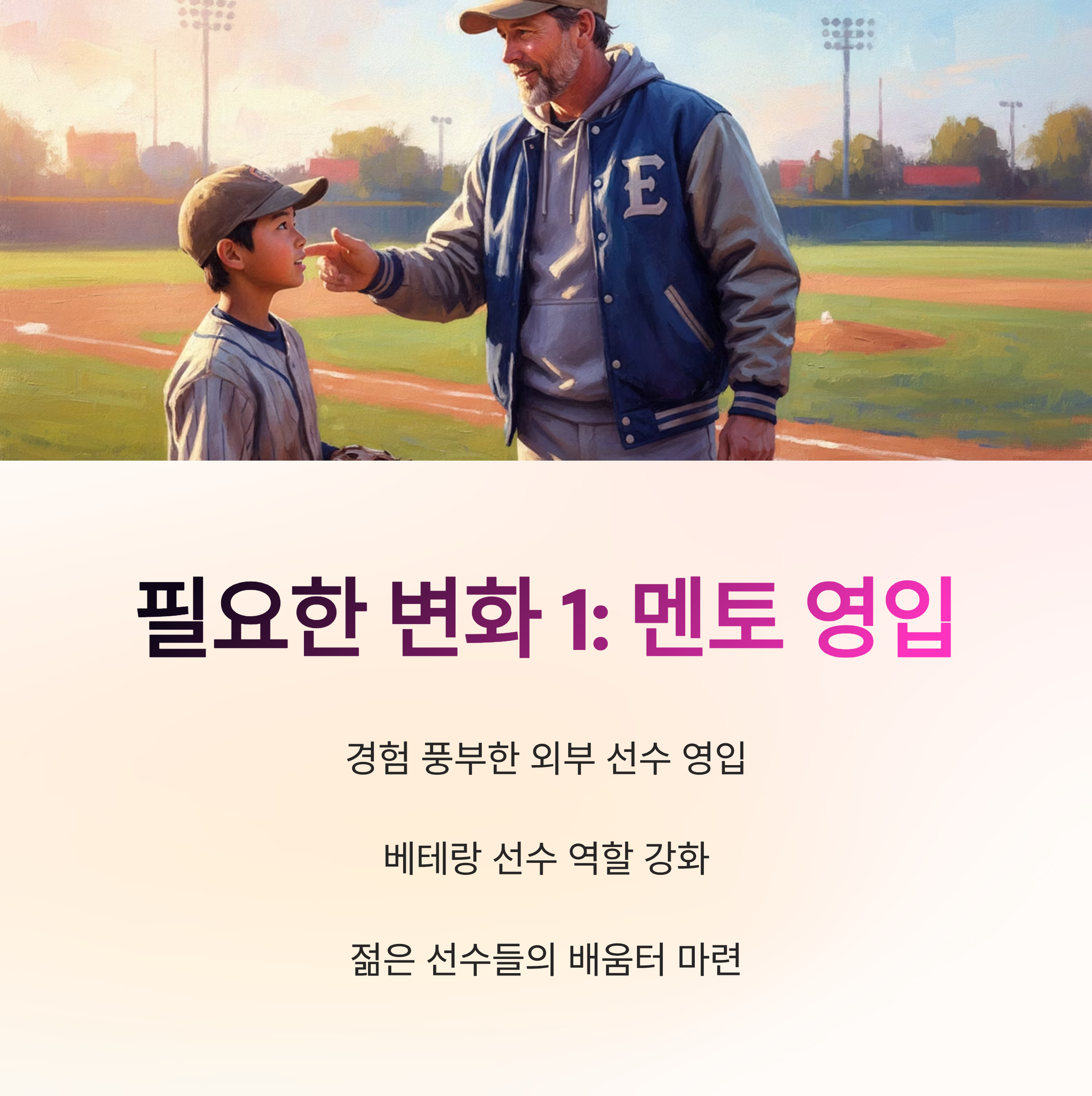 마지막으로 1군 경쟁 구도를 명확히 해서 선수들이 자리를 지키기 위해 더 노력하도록 만들어야 해요.젊고 활기찬 건 분명 장점이지만, 균형 잡힌 리더십과 내부 규율이 함께해야 그 장점을 제대로 살릴 수 있답니다.