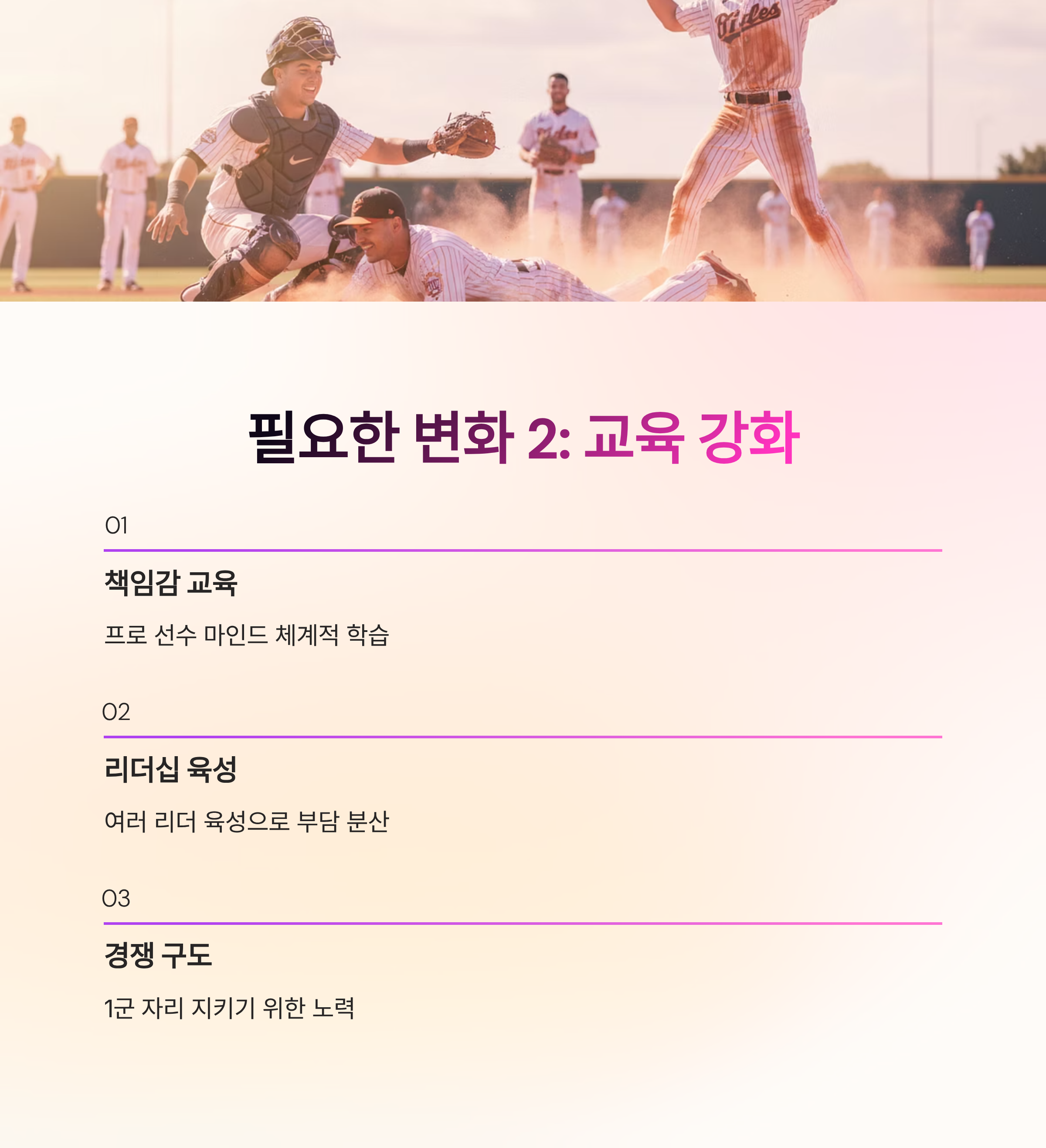 기회가 계속 주어진다는 인식 때문에 절실함이 떨어지고, 실질적인 통제력 없이는 내부 기강을 유지하기 어려웠어요. 또한 세대 간 문화 형성도 제대로 이뤄지지 않아 리더인 송성문 선수에게 과도한 부담이 집중됐던 거죠.5. 필요한 변화들