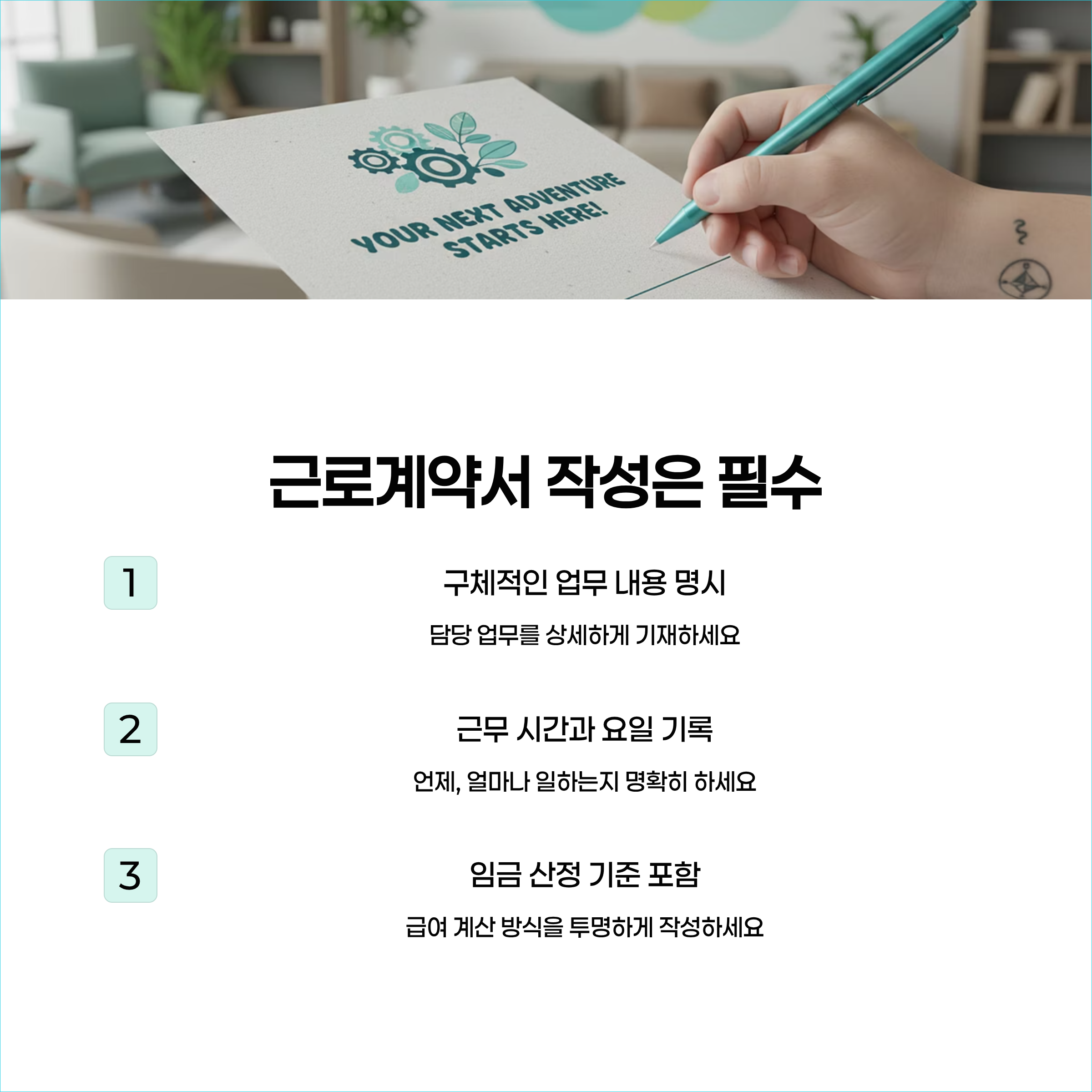 🔸 근로계약서 작성근로 시작 전, 자녀와 정식으로 근로계약서를 작성해야 합니다. 계약서에는 구체적인 업무 내용, 근무 시간 및 요일, 임금 (산정 기준 포함), 그리고 지급일 등을 상세히 명시해야 합니다. 이는 사업체와 자녀 간의 정식 고용 관계를 확인하는 기본 서류입니다.