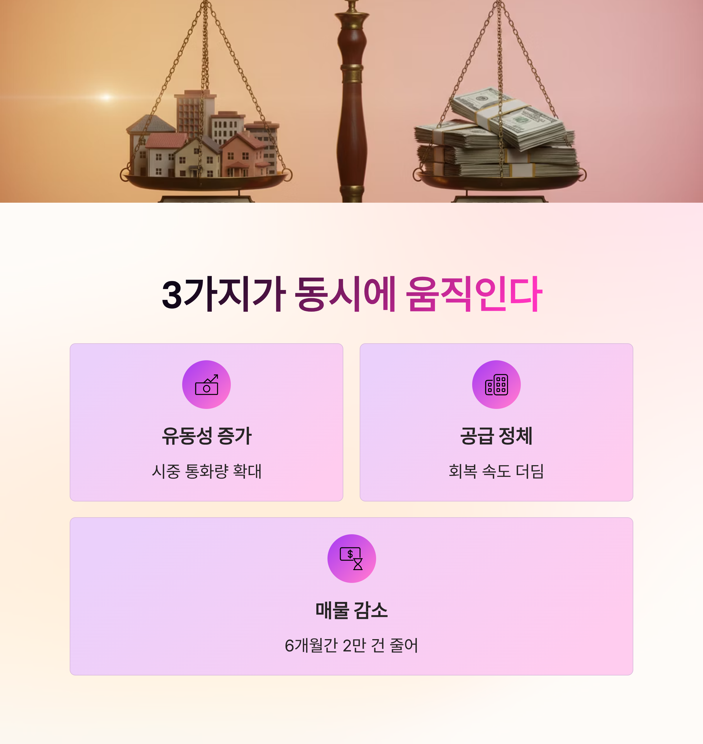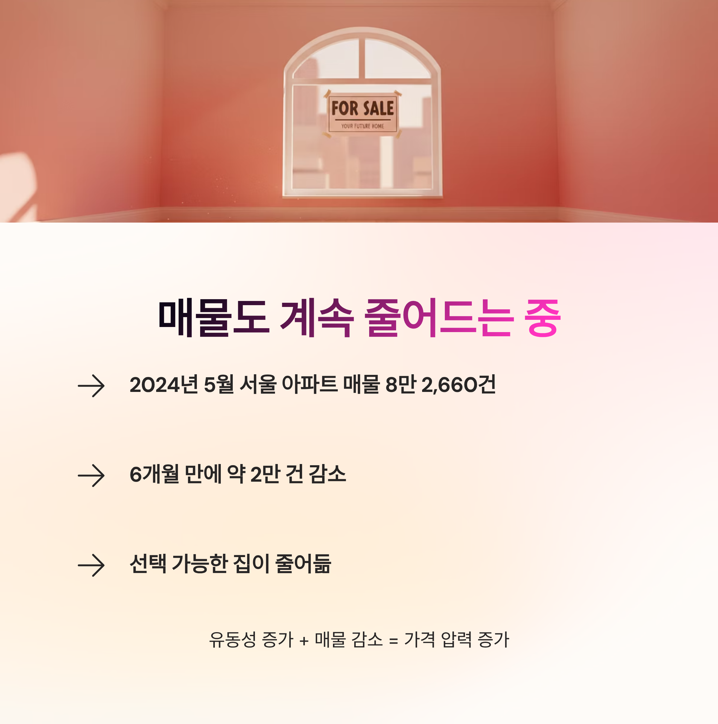 매물이 줄어든다는 것은, 시장에서 선택할 수 있는 집의 수가 줄고 동시에 유동성이 많아진다면 가격 상승 압력으로 이어지기 쉬운 구조가 됩니다.