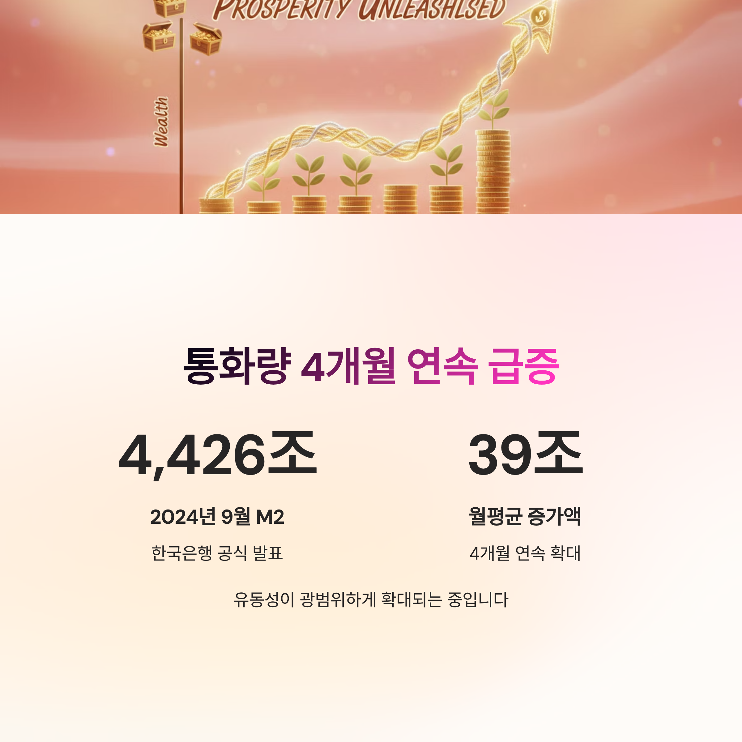 한국은행이 11월 12일 발표한 2024년 9월 기준 M2는 4,426조 원으로 집계되었으며, 매달 약 39조 원씩 증가하는 흐름이 이어졌습니다.