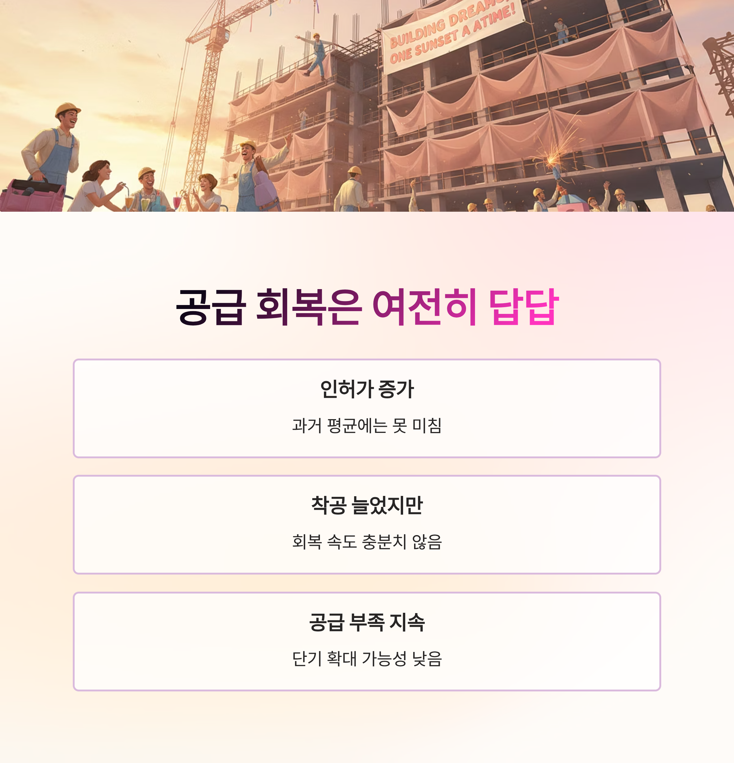 즉, 공급 회복 속도가 충분하지 않아 시장 전체의 주택 물량이 빠르게 늘어나기 어렵다는 점이 지적되고 있습니다.