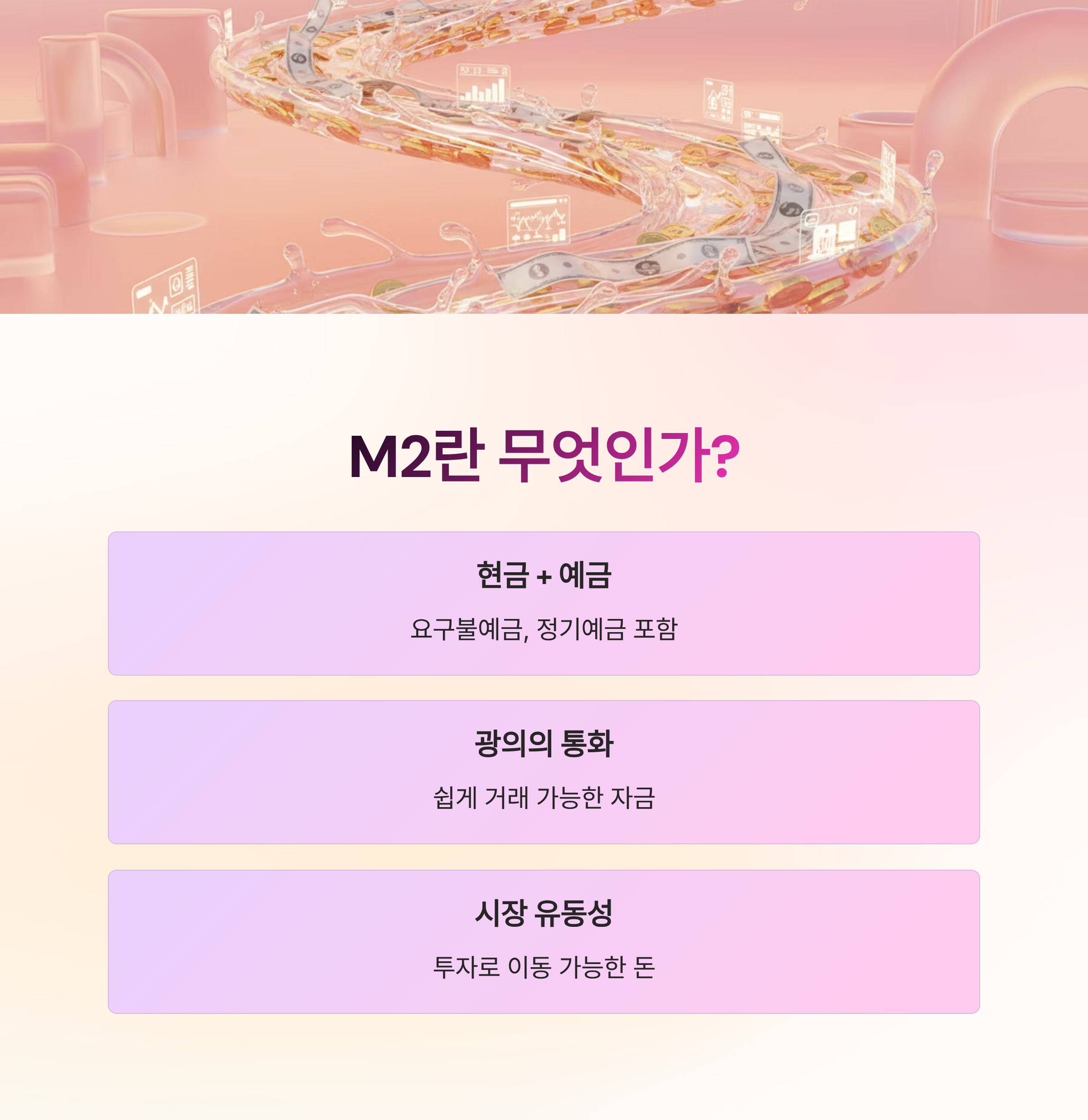M2는 현금, 요구불예금, 정기예금 같은 광의의 통화, 즉 실제로 시장에서 거래나 투자로 쉽게 이동할 수 있는 자금 규모를 의미합니다.