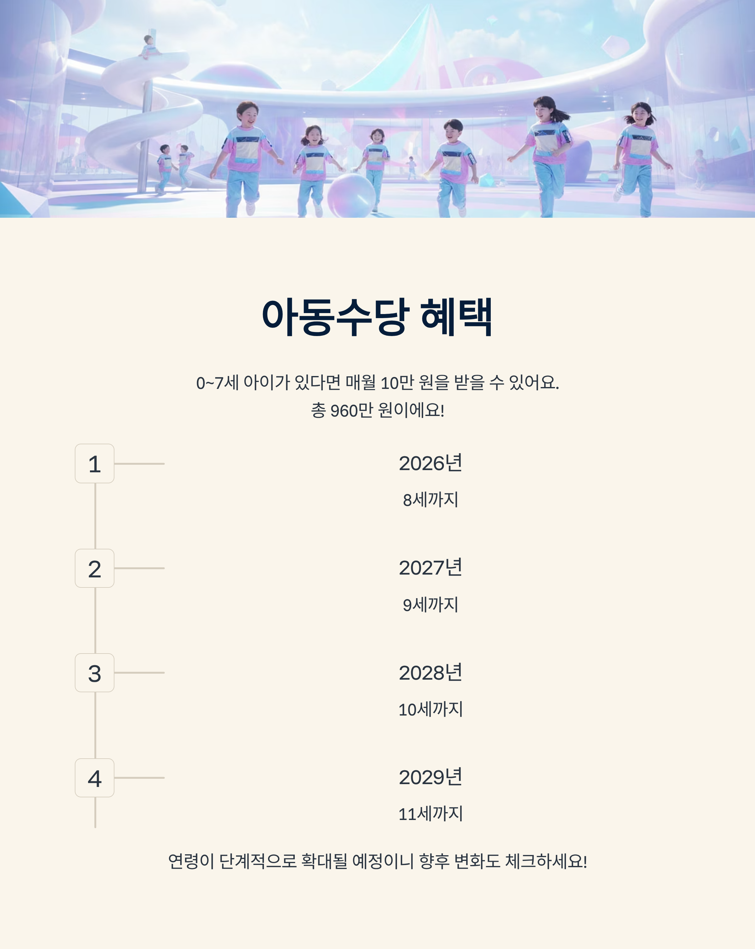 또한 정부는 2026년부터 2029년까지 매년 지급 대상 연령을 한 살씩 확대할 계획이에요.