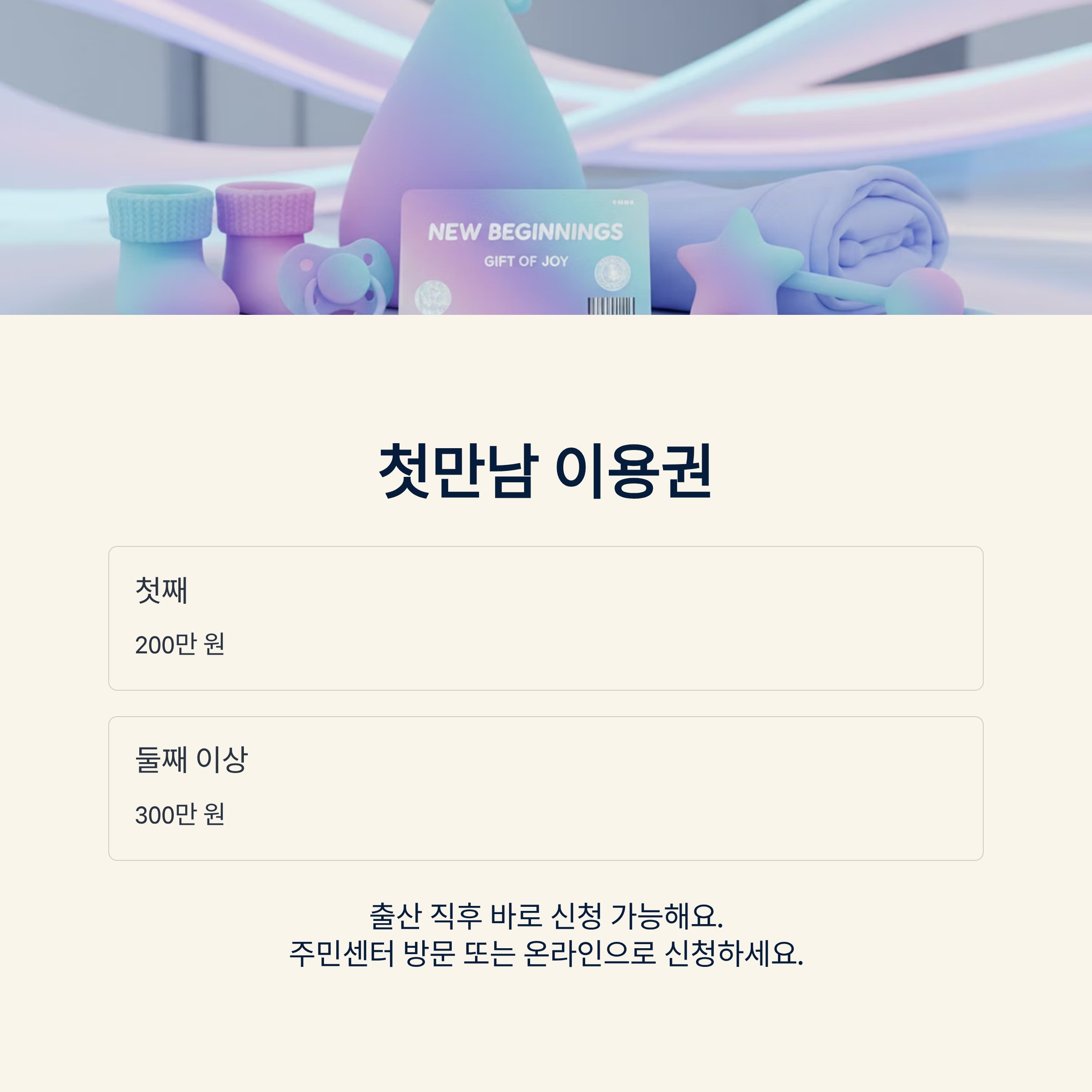 신생아가 있는 모든 가정에 지급되며 첫째 200만 원, 둘째 이상 300만 원으로 제공돼요. 전용 바우처 방식으로 결제되며, 육아 용품·아기 관련 서비스 등 사용 가능한 범위가 정해져 있다는 점을 함께 기억해두시면 좋아요.