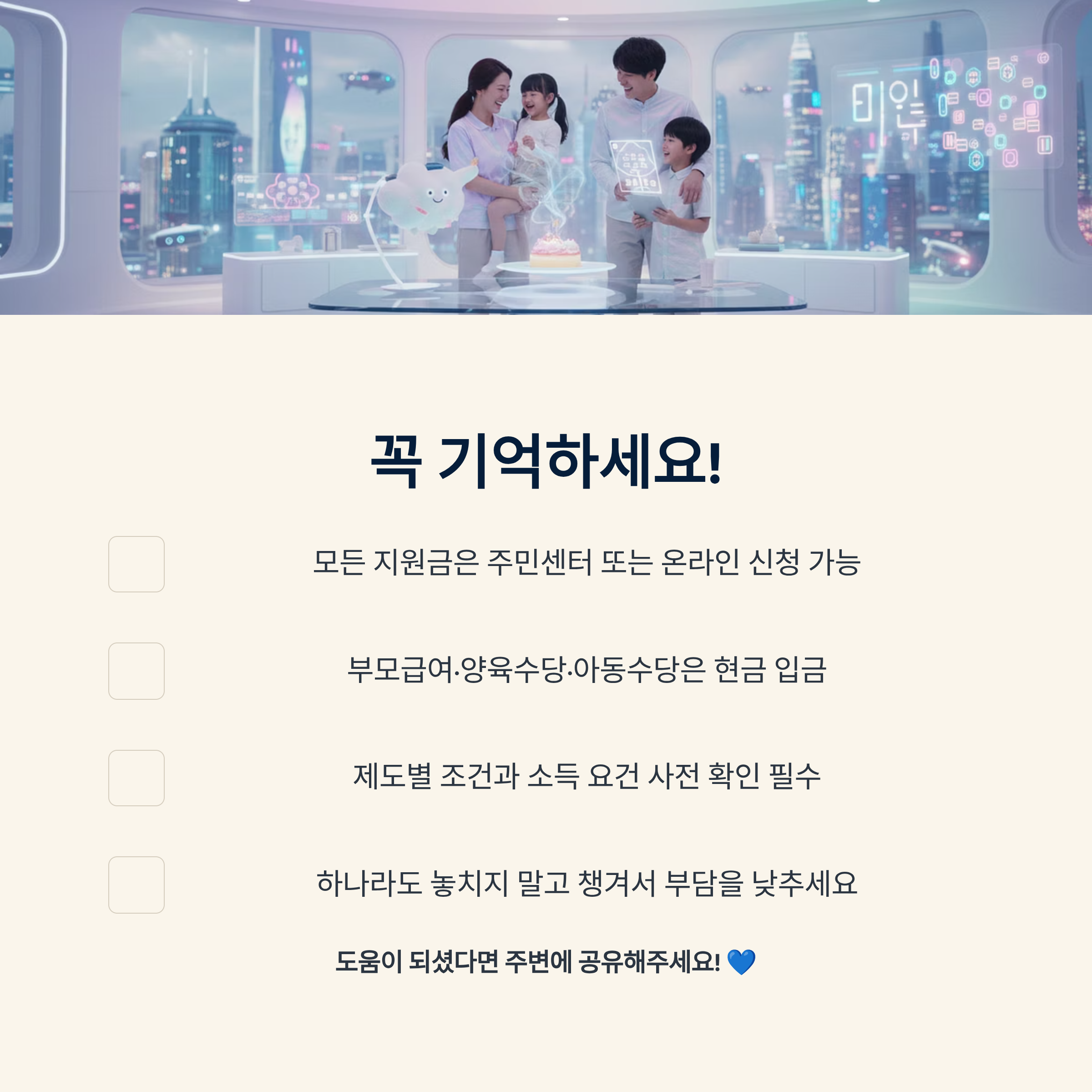 🔸 육아 지원금은 제도별 조건·신청 기준·소득 요건에 따라 달라지기 때문에, 해당 시점의 기준을 함께 확인하는 것이 가장 안전해요.
