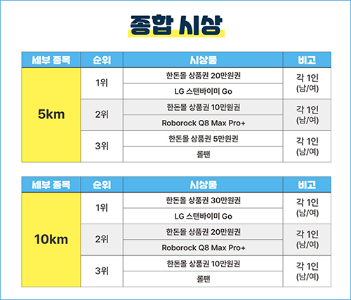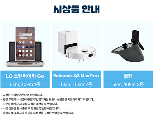 • 5K, 10K 모든 코스에서 시상 진행 • 1등 특별상: 한돈몰 상품권 + LG 스탠바이미 고 • 기타 순위별로도 다양한 상품 준비