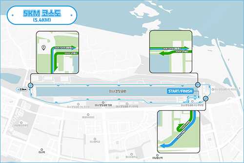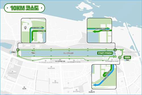 • 미사경정공원을 중심으로 한 순환 코스 • 10K와 5K 모두 같은 지역을 도는데, 거리에 따라 경로가 달라짐 • 순환 코스라서 뒤쳐져도 걱정할 필요 없음 • 별도의 회수차도 필요 없어 편안하게 참여 가능 • 배번호에는 기록칩이 일체형으로 부착되어 전문적인 느낌