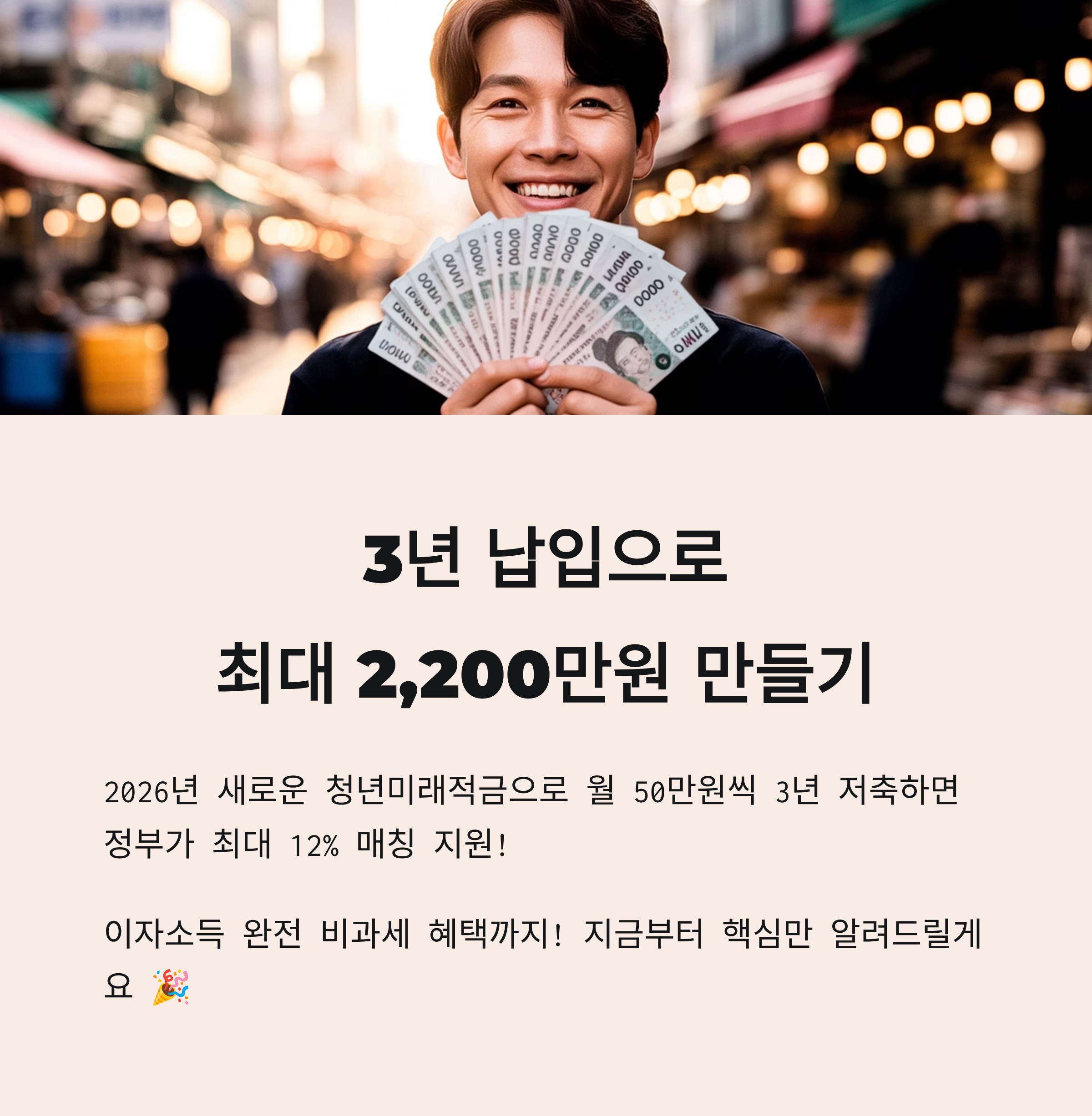 정부가 여러분의 저축액에 따라 최대 12%까지 매칭 지원을 해주는 이 상품이면, 월 50만원씩 3년만 저축해도 2,200만원대의 목돈을 만들 수 있어요. 게다가 이자소득은 완전 비과세! 이런 혜택을 놓치면 정말 아쉽겠죠?
