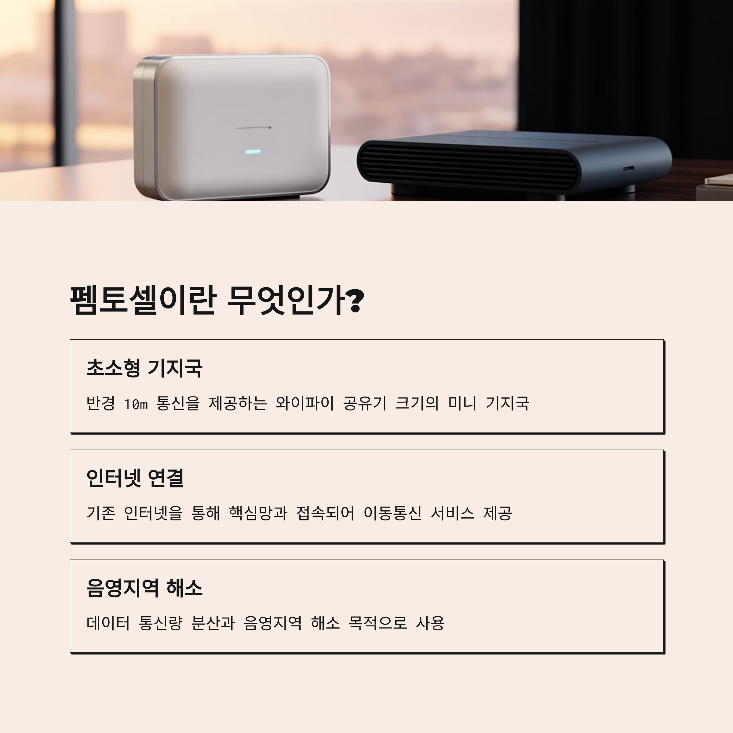 펨토셀(Femtocell)은 가정이나 소규모 사무실을 위한 초소형, 저전력의 이동통신 기지국입니다. 서비스 가능 반경이 수십미터 이내인 초소형 기지국으로, 마치 와이파이 공유기처럼 생긴 미니 기지국이라고 생각하면 쉬워요.