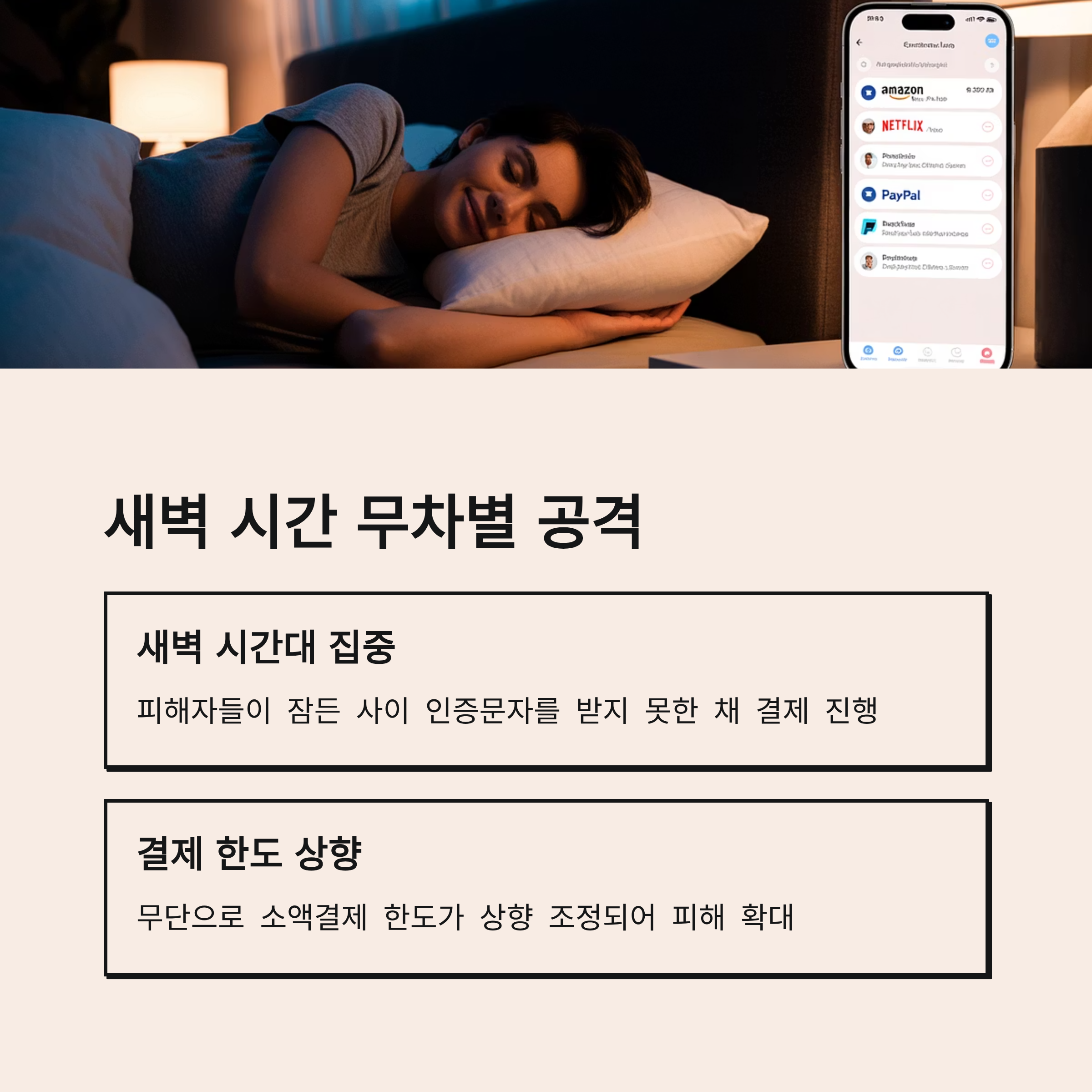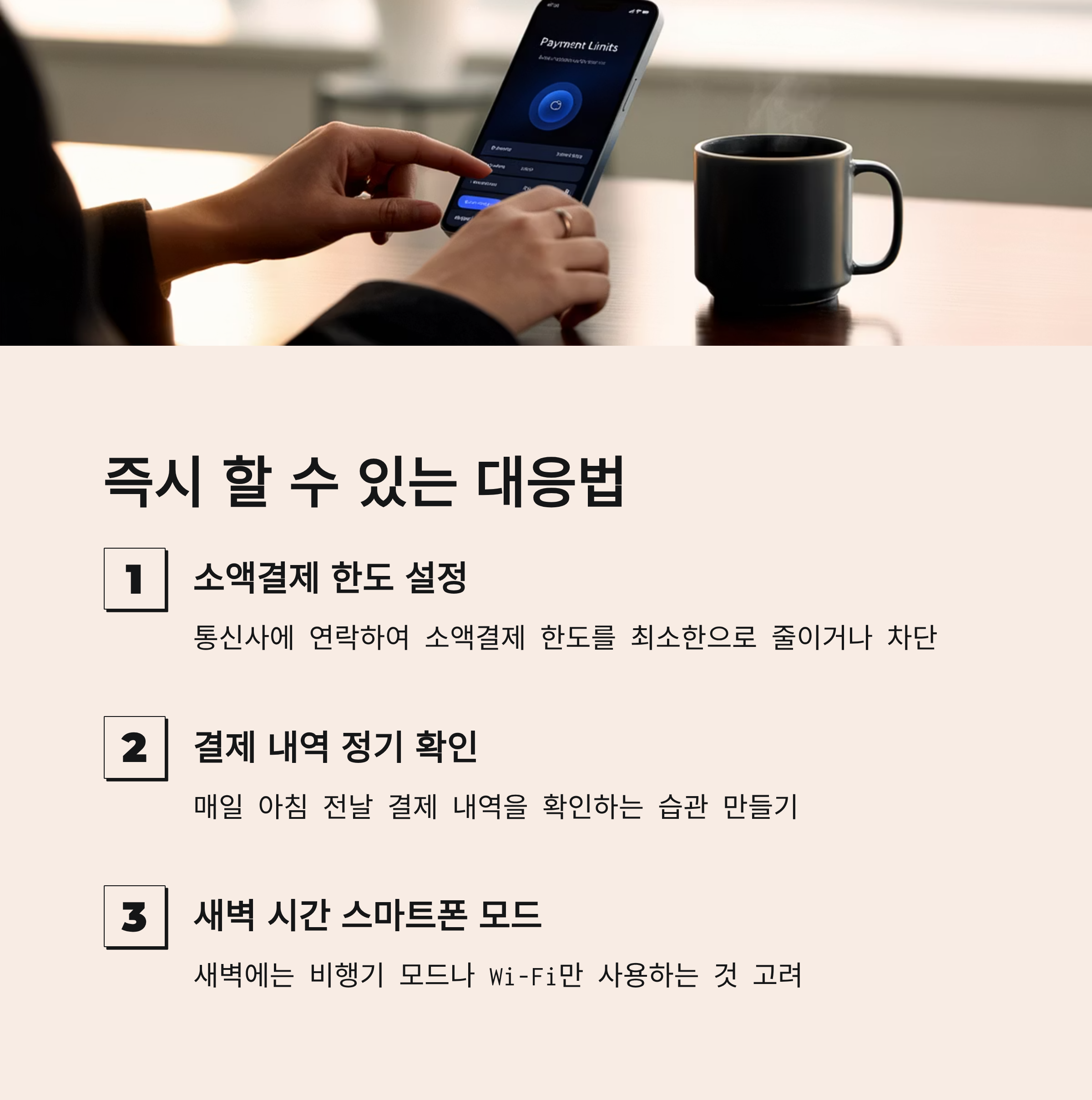 1. 소액결제 한도 설정: 통신사에 연락하여 소액결제 한도를 최소한으로 줄이거나 아예 차단하세요 2. 결제 내역 정기 확인: 매일 아침 전날 결제 내역을 확인하는 습관을 만드세요 3. 새벽 시간 스마트폰 모드: 새벽에는 비행기 모드나 Wi-Fi만 사용하는 것을 고려해보세요
