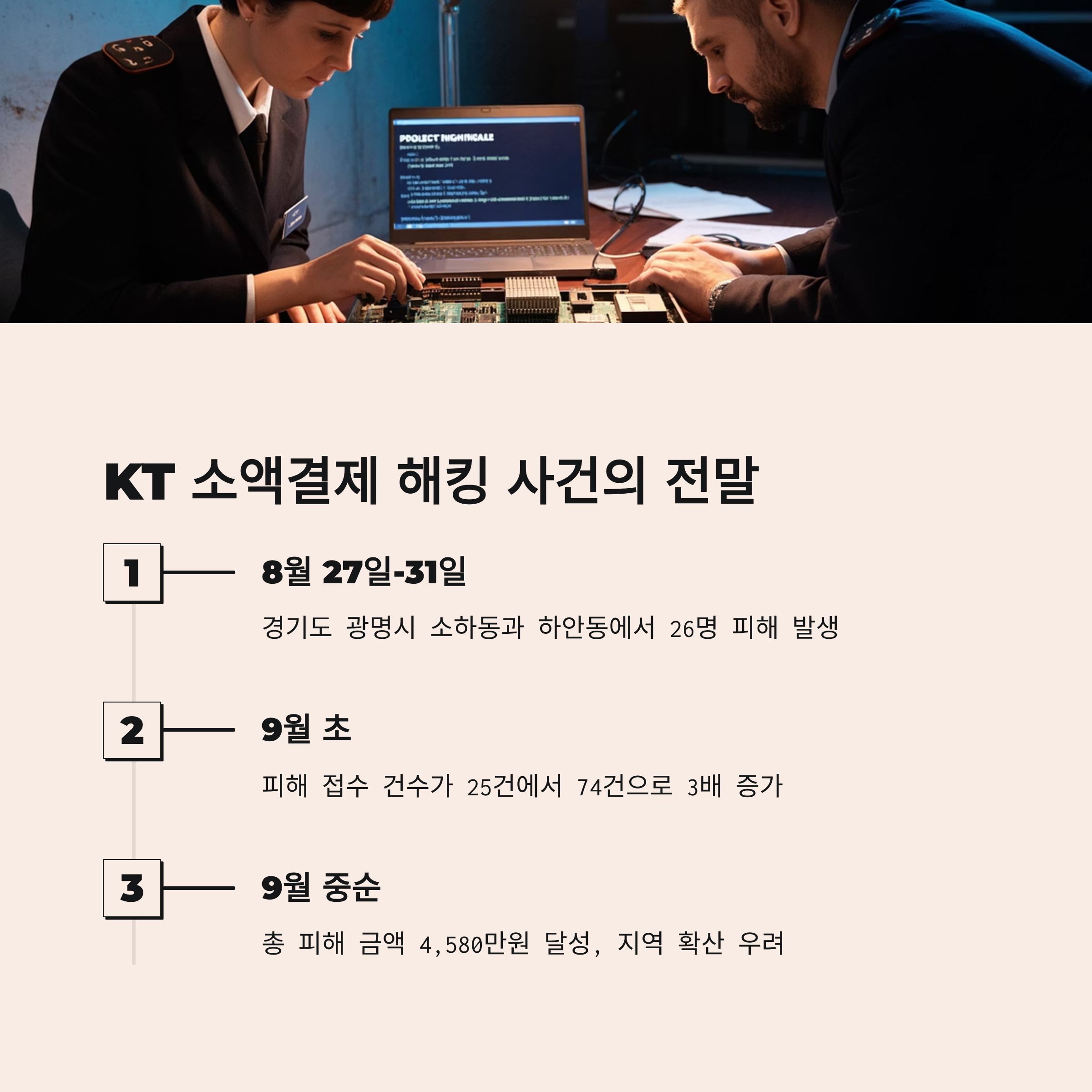 KT는 최근 경기도 광명 일대에서 발생한 소액결제 피해와 관련해 지난 8일 오후 7시 16분 한국인터넷진흥원(KISA)에 침해 사고 신고 조치했다고 발표했습니다.