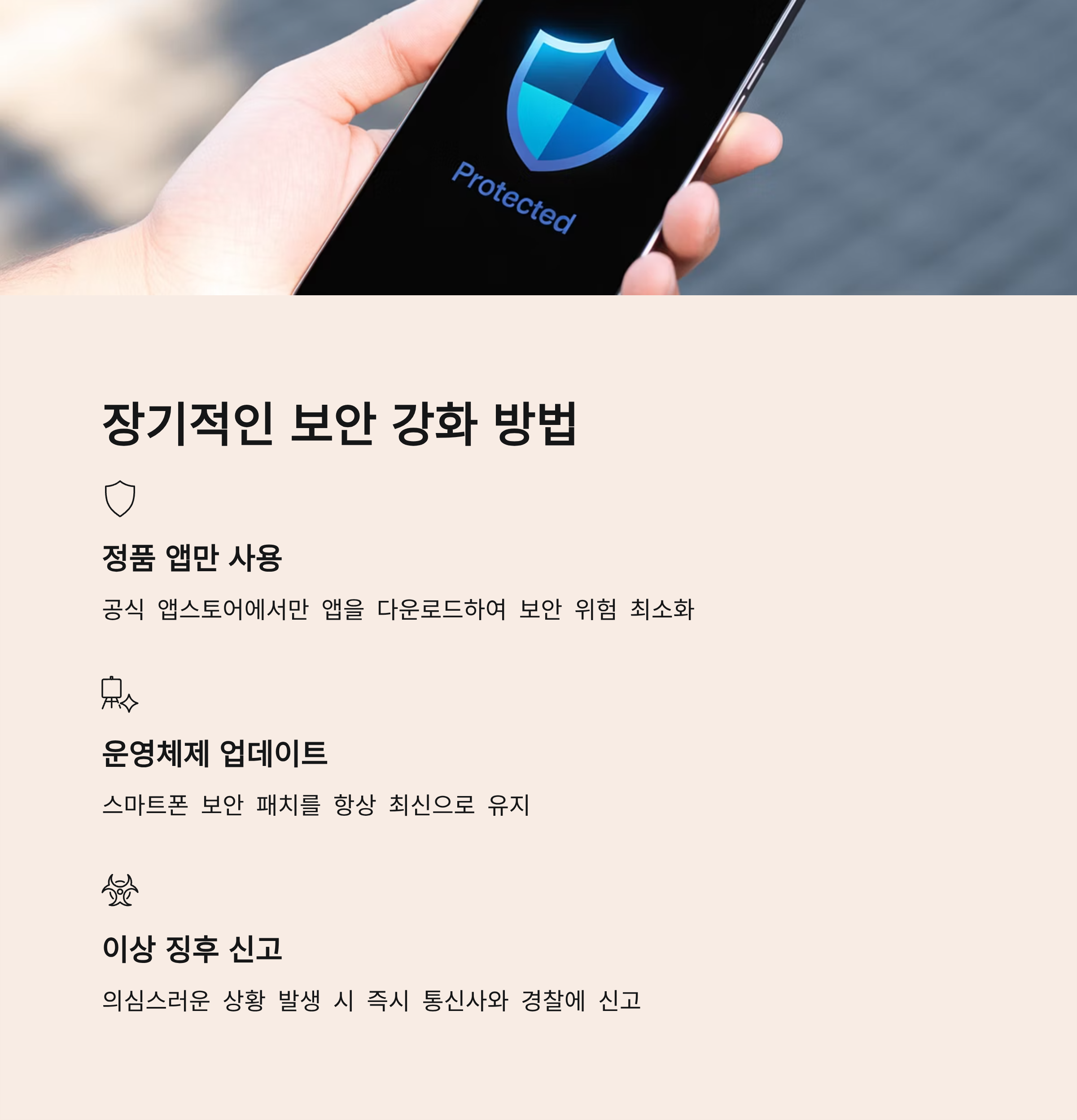1. 정품 앱만 사용: 공식 앱스토어에서만 앱을 다운로드하세요 2. 운영체제 업데이트: 스마트폰 보안 패치를 항상 최신으로 유지하세요 3. 이상 징후 신고: 의심스러운 상황이 발생하면 즉시 통신사와 경찰에 신고하세요
