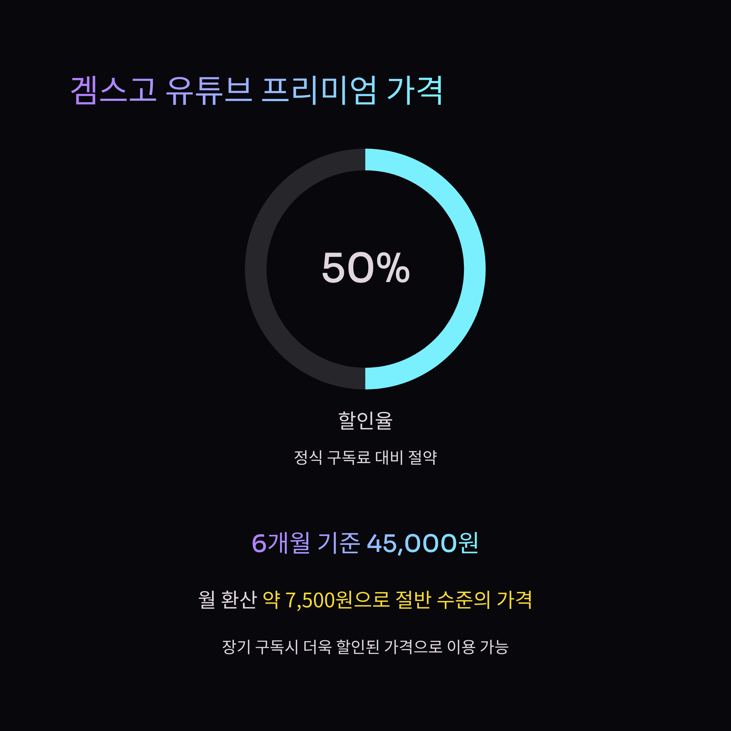 정식 유튜브 프리미엄 월 14,900원과 비교해서, 겜스고에서는 6개월 기준 45,000원 정도로 이용할 수 있습니다. 월 환산 시 약 7,500원으로 절반 수준의 가격이에요.