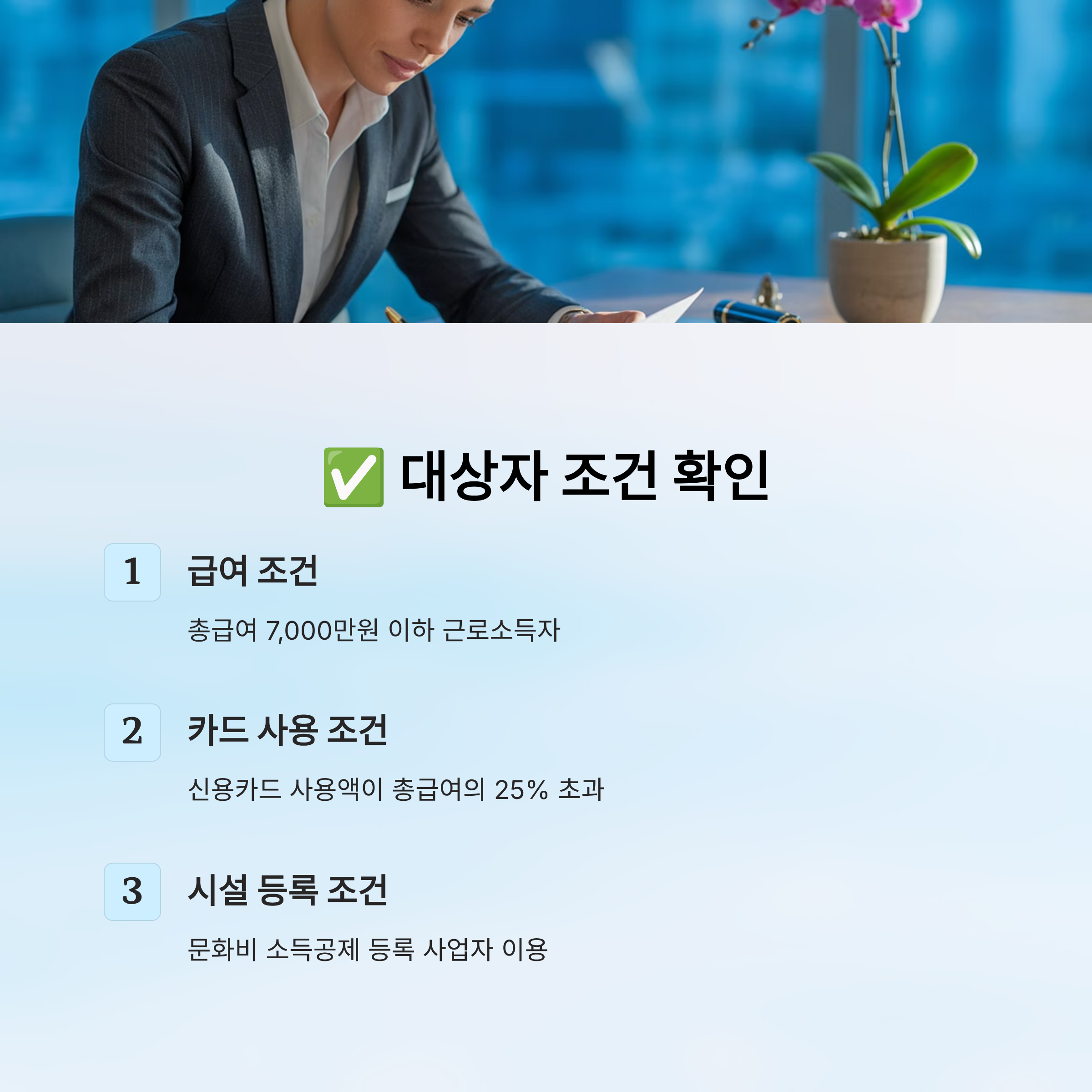 📢 다만 주의할 점은 각종 문화비와 전통시장 및 대중교통 이용금액 소득공제까지 포함한 최대 한도가 300만원이라는 점이에요. 즉, 모든 문화비 지출을 합쳐서 계산된답니다.✅ 대상자 조건 확인하기