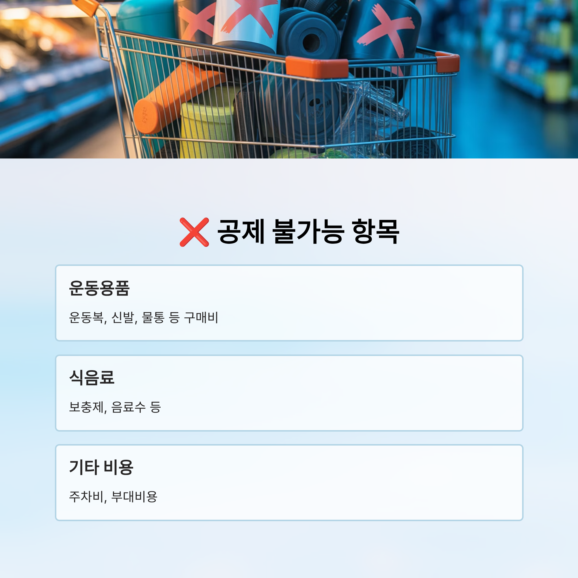 ❌ 공제 불가능 항목• 운동용품 구매비 (운동복, 신발, 물통 등)