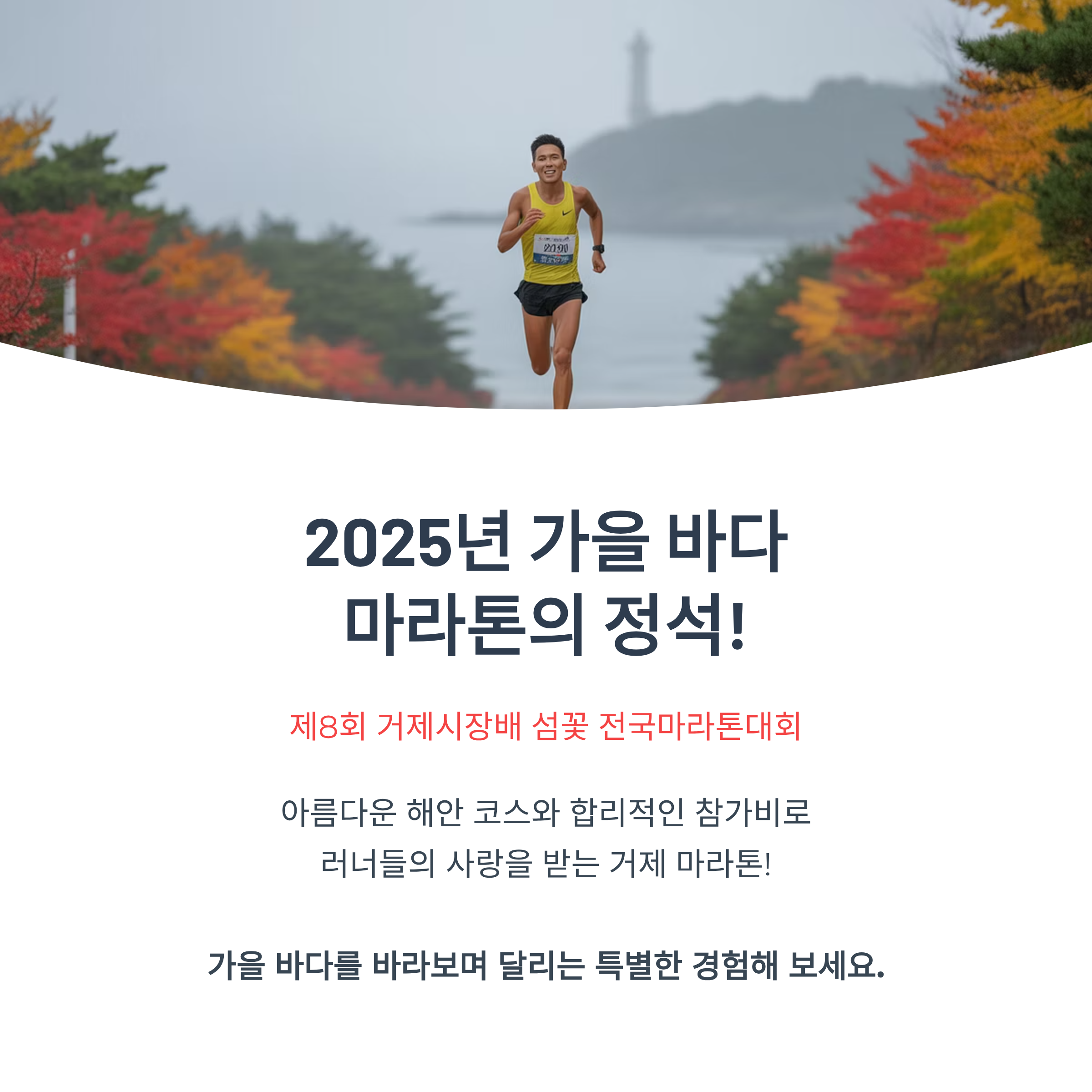 제8회 거제시장배 섬꽃 전국마라톤대회는 아름다운 바다와 함께하는 특별한 가을 마라톤입니다.