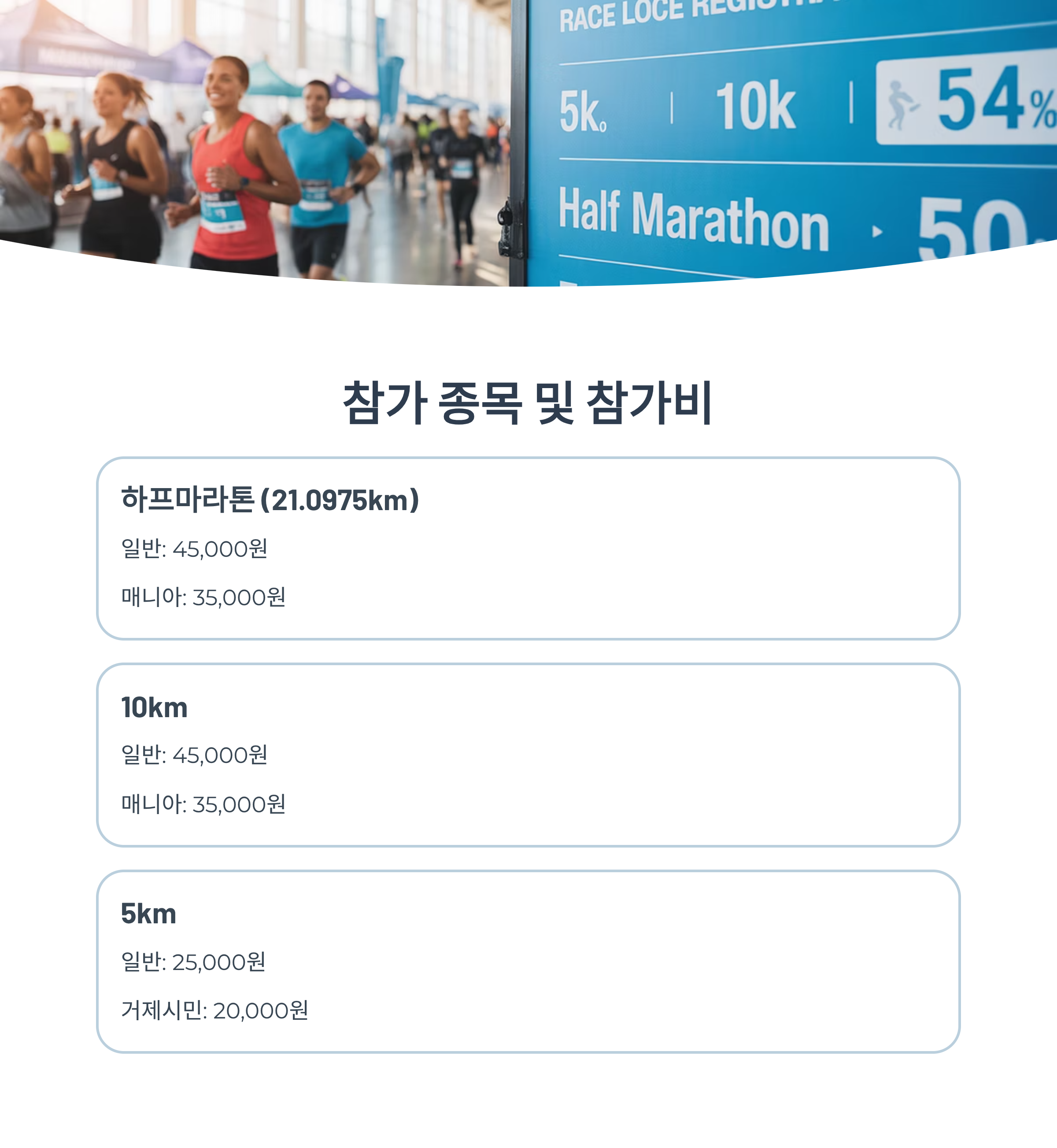 📢 이 대회는 매년 10월에 개최되는 전통 있는 마라톤 행사로, 전국의 마라톤 애호가들이 참가하는 인기 대회입니다.참가 종목 및 참가비 안내