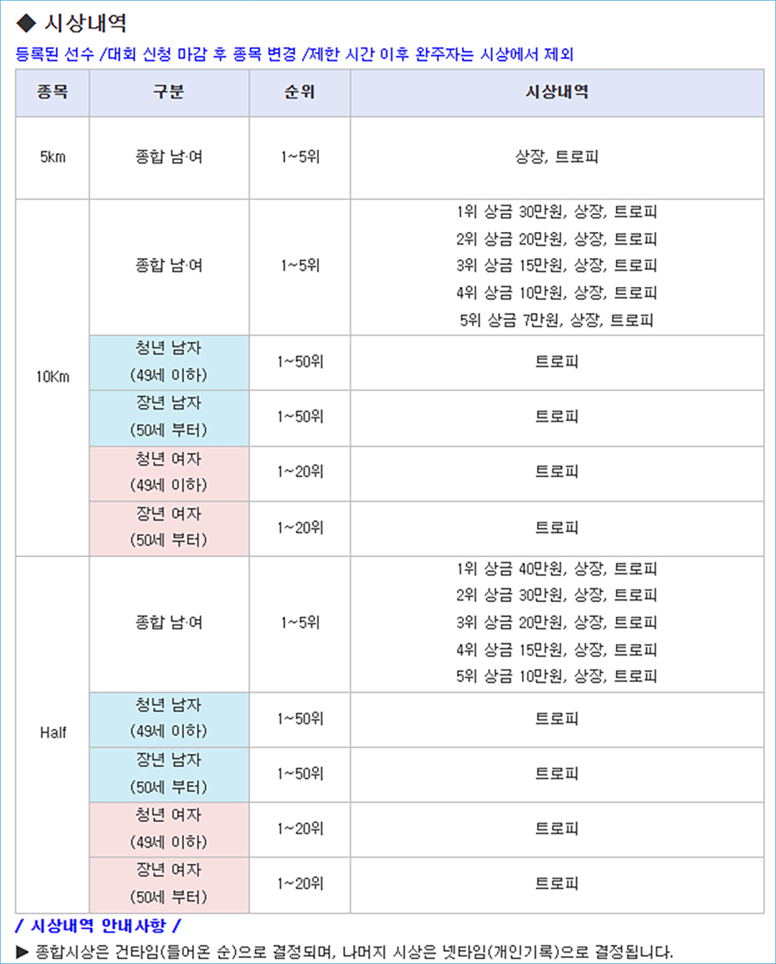 각 종목(하프·10km·5km)별로 1위부터 5위까지 시상합니다.