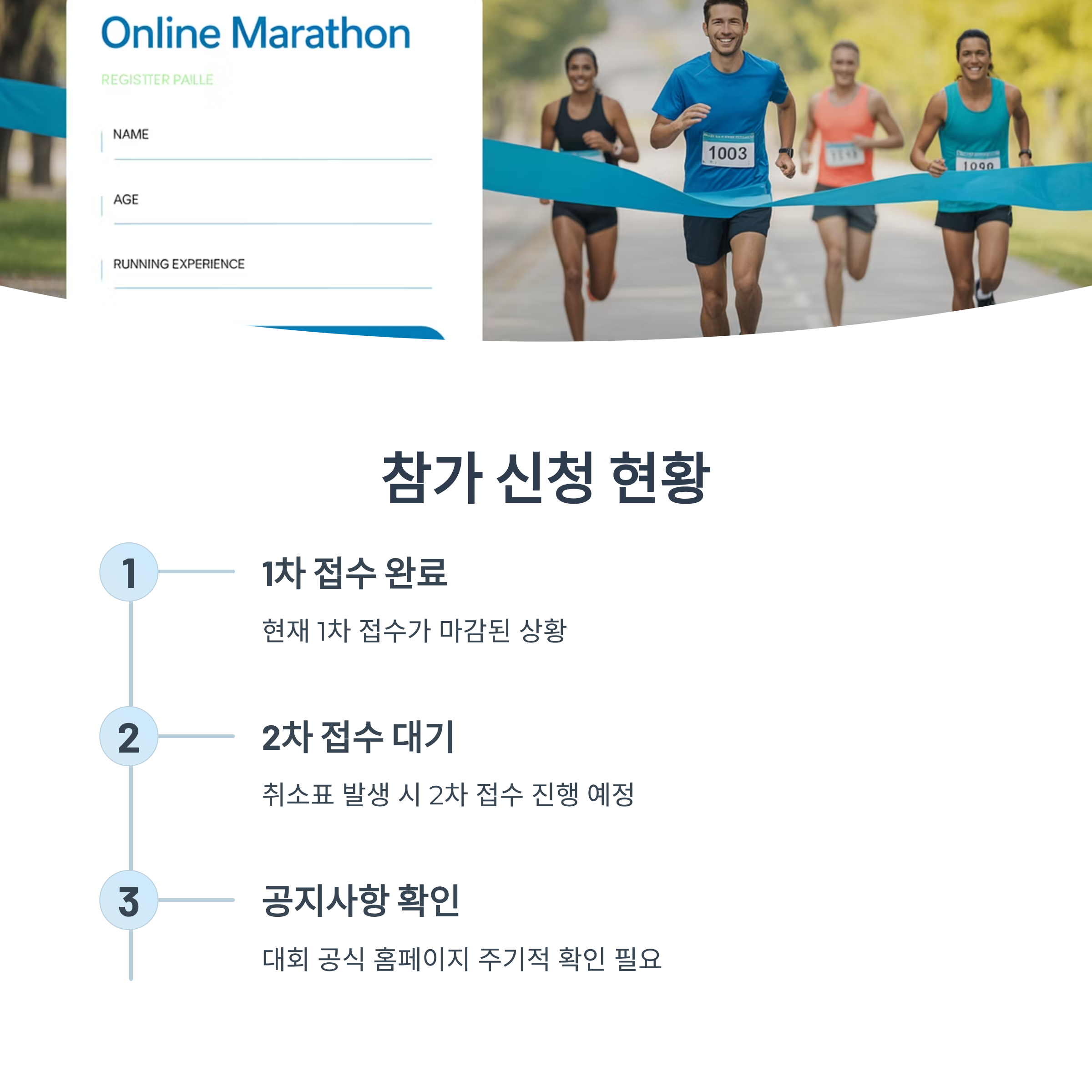 현재 1차 접수가 완료된 상황입니다. 하지만 취소표가 발생할 경우 2차 접수가 진행될 수 있으니, 대회 공식 홈페이지의 공지사항을 주기적으로 확인해주세요.