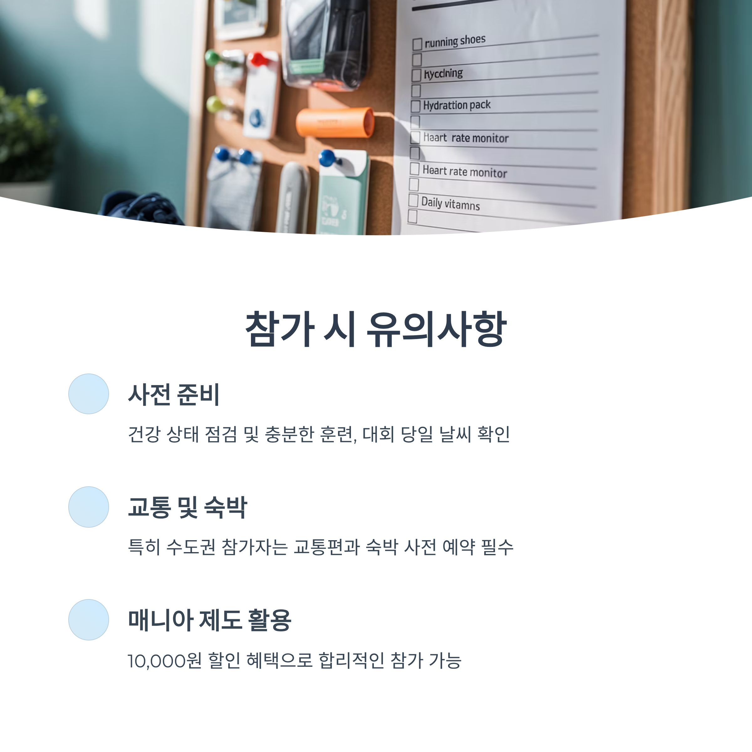 매니아 제도 활용 팁불필요한 기념품보다는 저렴한 참가비를 선호하는 경험 많은 러너들에게는 매니아 제도가 매우 합리적인 선택입니다. 10,000원의 할인 혜택을 받으면서도 메달과 기록증은 동일하게 받을 수 있습니다.