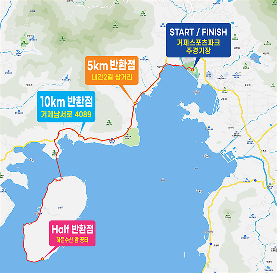 거제 섬꽃 마라톤은 하프마라톤(21.0975km), 10km, 5km 총 3개 종목으로 구성됩니다.